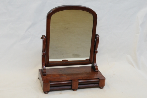 Kaptafel - z.j., hout, glas, metaal, 68 x 55,5 x 28 cm, een houten kaptafel voor op een kast met twee laatjes en een aan de bovenzijde afgeronde en in hout ingelijste spiegel. Verstelbaar met vleugelschroeven