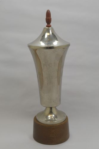 Prijsbeker met deksel – 1978, materiaal: verchroomd metaal en hout (standvoet en dekselknopje), afmetingen: 31 x 10 cm, met de inscriptie: ‘N.K.G.B. / Eindhoven / Kampioen 1978 / Dames’