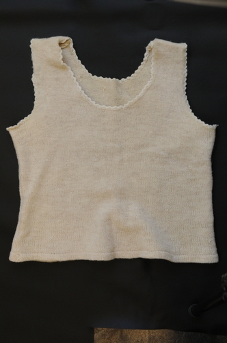 Dameshemd – 2e kwart van de 20e eeuw, materiaal: wol, kleur: ecru, lengte 47,5 cm, breedte 45 cm, armsgaten en hals omgehaakt, in huisvlijt vervaardigd