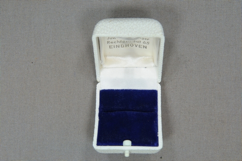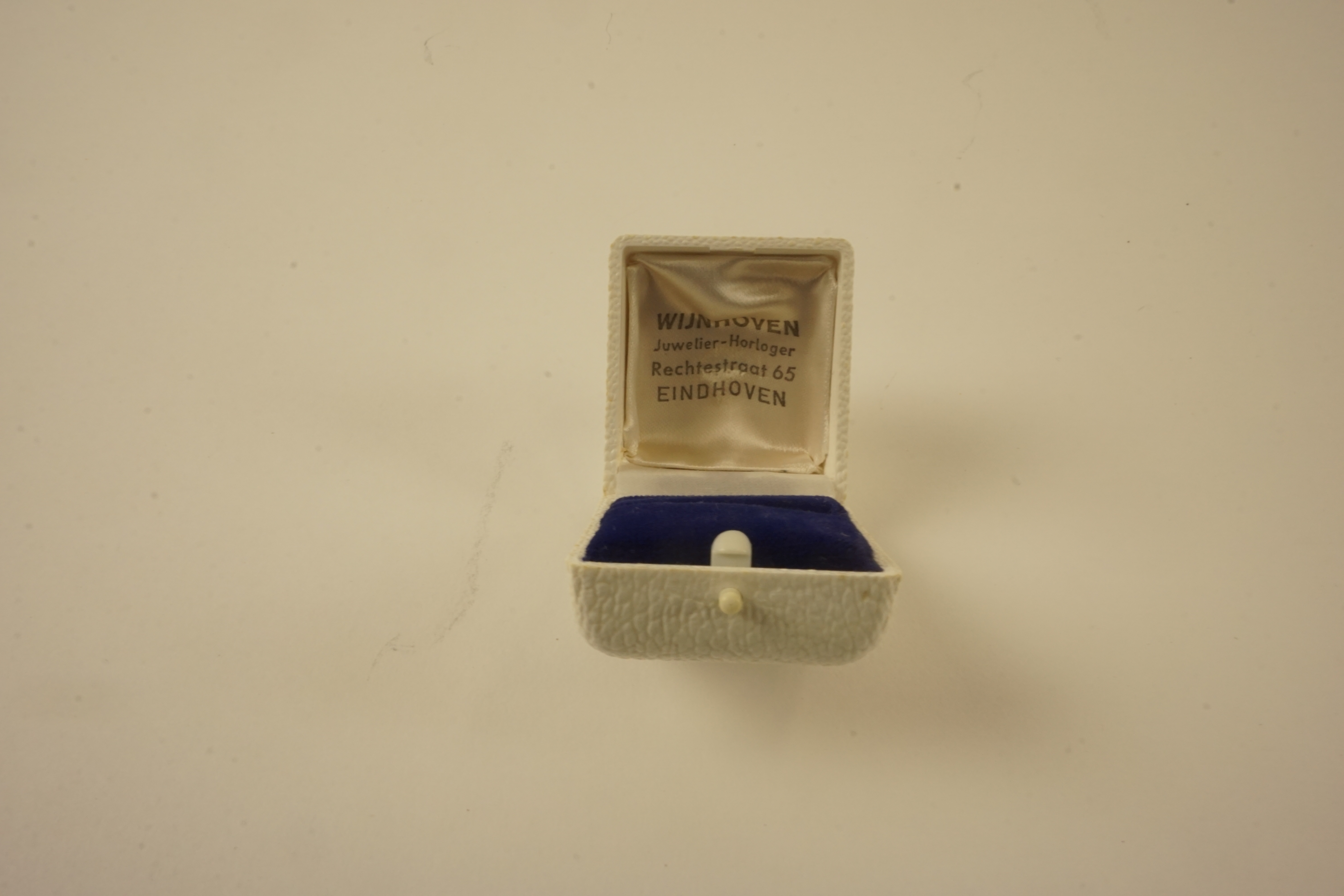 Wit kunststof juweliersdoosje met schuimrubber/fluwelen padding en aan binnenzijde deksel firmagegevens 'WIJNHOVEN Juwelier-Horloger Rechtestraat 65 EINDHOVEN'