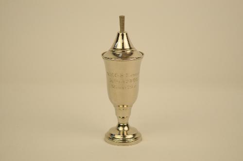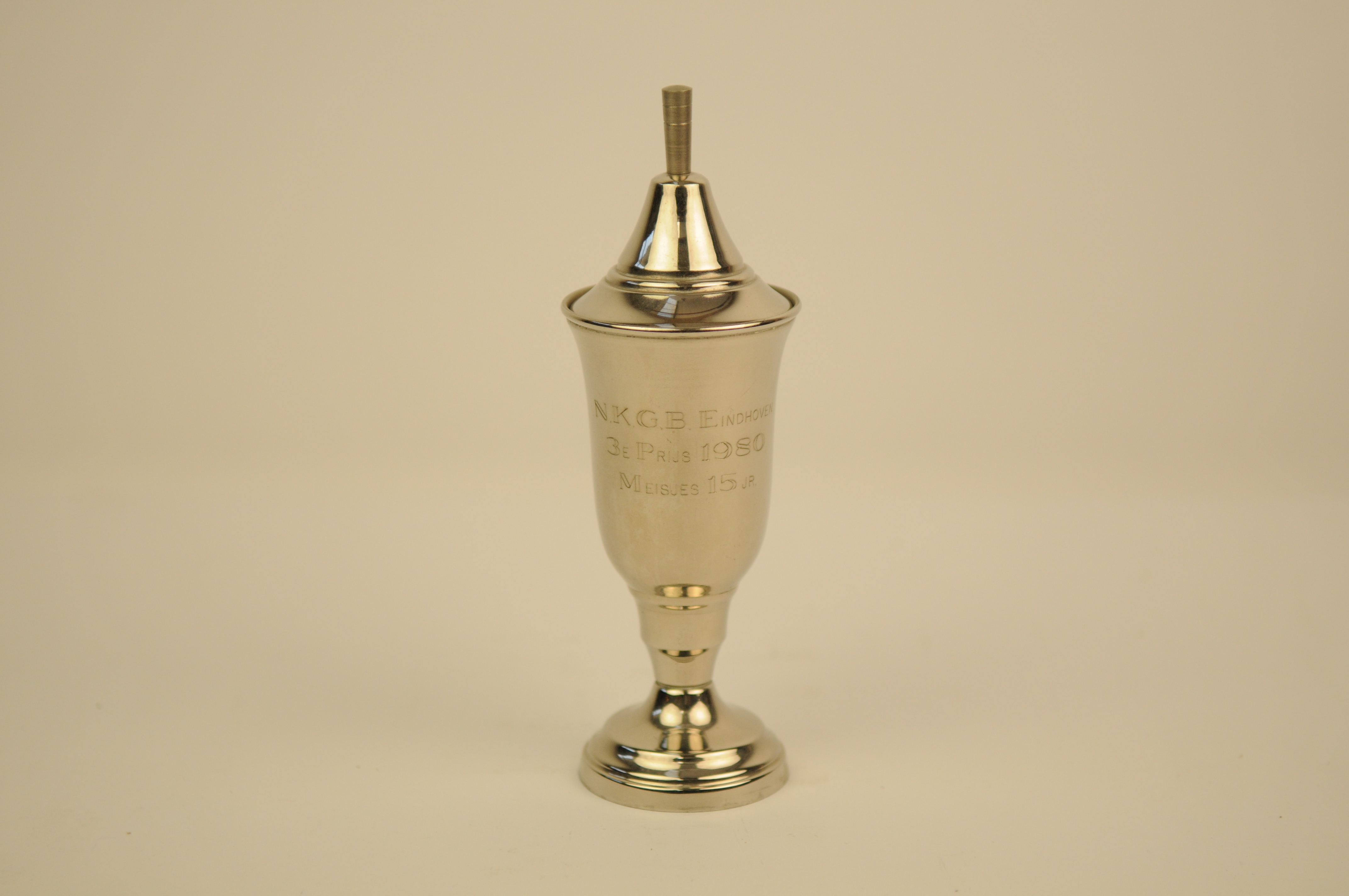 Prijsbeker, deksel ontbrekend ?, inschrift: N.K.G.B. Eindhoven 3e prijs 1980 meisjes 15 jr. binnenin etiket Medaillehuis Suurd BV Groningen, metaal, 13 x 6 cm