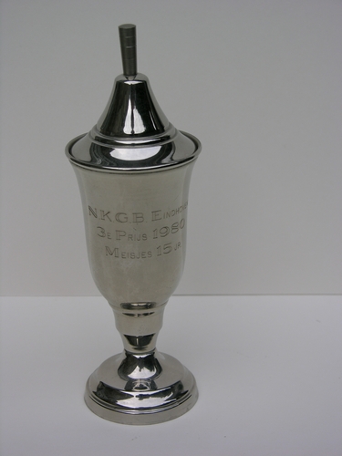 Prijsbeker, deksel ontbrekend ?, inschrift: N.K.G.B. Eindhoven 3e prijs 1980 meisjes 15 jr. binnenin etiket Medaillehuis Suurd BV Groningen,