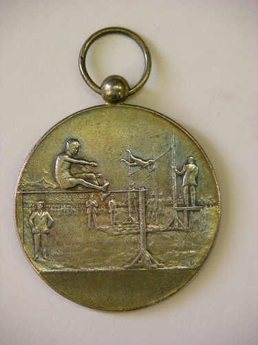 Ronde prijsmedaille/draagpenning met recto: atletiekoefeningen in de open lucht, waarbij enkele jongemannen op brug en bij hoogspringen en kijkende omstanders. opschrift: 'B.U.' (= Begeer Utrecht). Verso; rechts reliëfafbeelding van staande vrouwfiguur in antieke kledij met lauwerkrans en lauwertak in de hand. Links daarvan inschrift: 'Heerlensch sportcomité 14 juli 1918 1e prijs vierkamp voor vereenigingen' r.o. ...