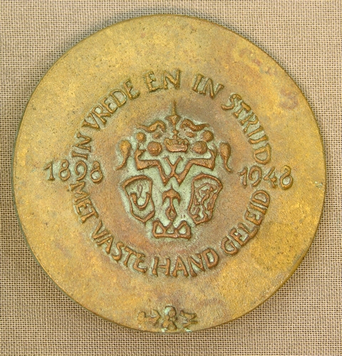 Voorzijde: afbeelding van vrouwenfiguur met rechte rug, met kroon en scepter gezeten op een strijdbaar ros dat elegant stapt (ontleend aan het grootzegel van H.K.H. Wilhelmina Vorstin der Nederlanden) Randschrift: '50 JARIG REGERINGSJUBILEUM H.M KONINGIN WILHELMINA'. Keerzijde: gekroonde letter W. met wapens en versierselen. Daaromheen het opschrift: 'IN VREDE EN IN STRIJD MET VASTE HAND ...