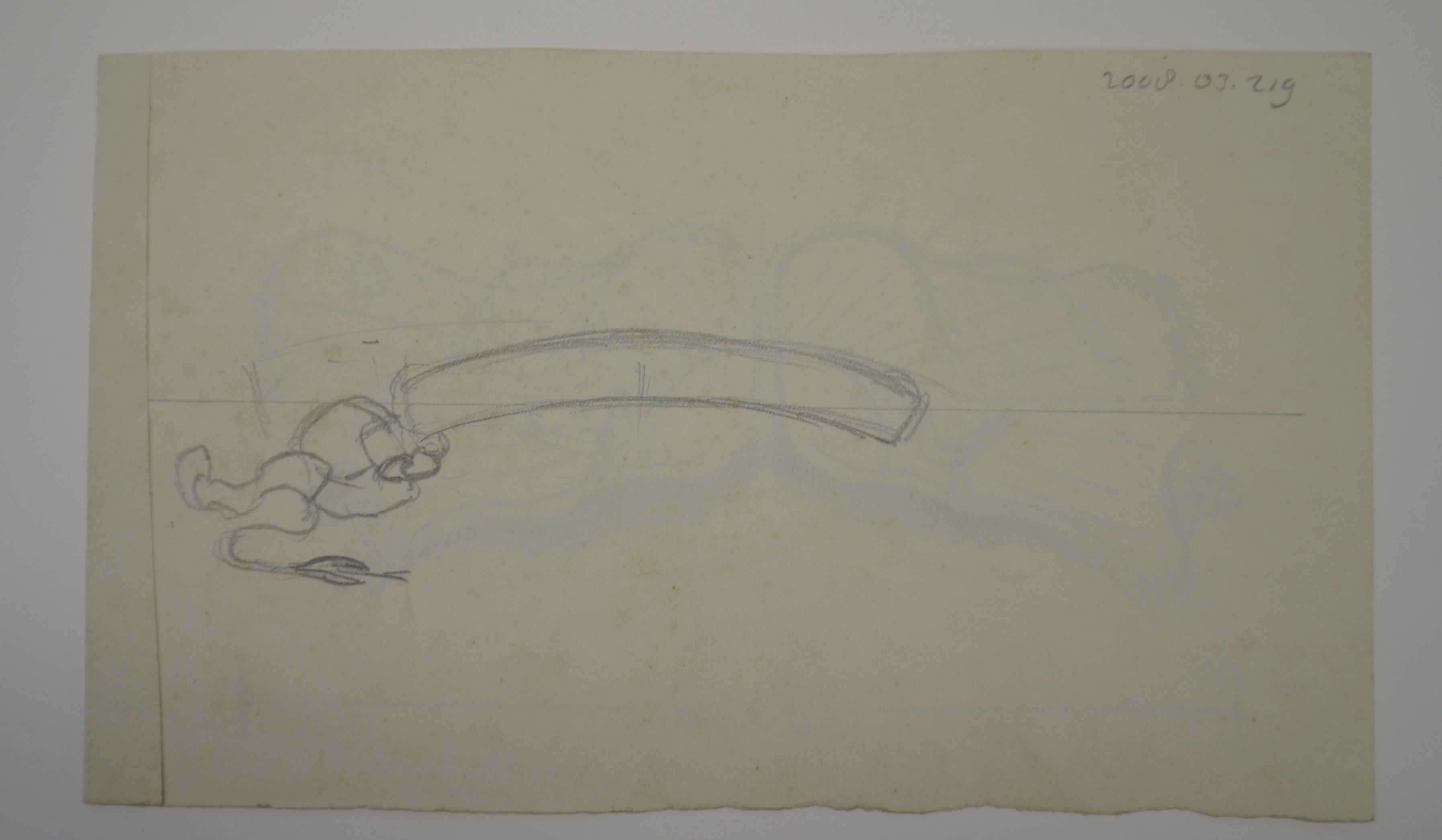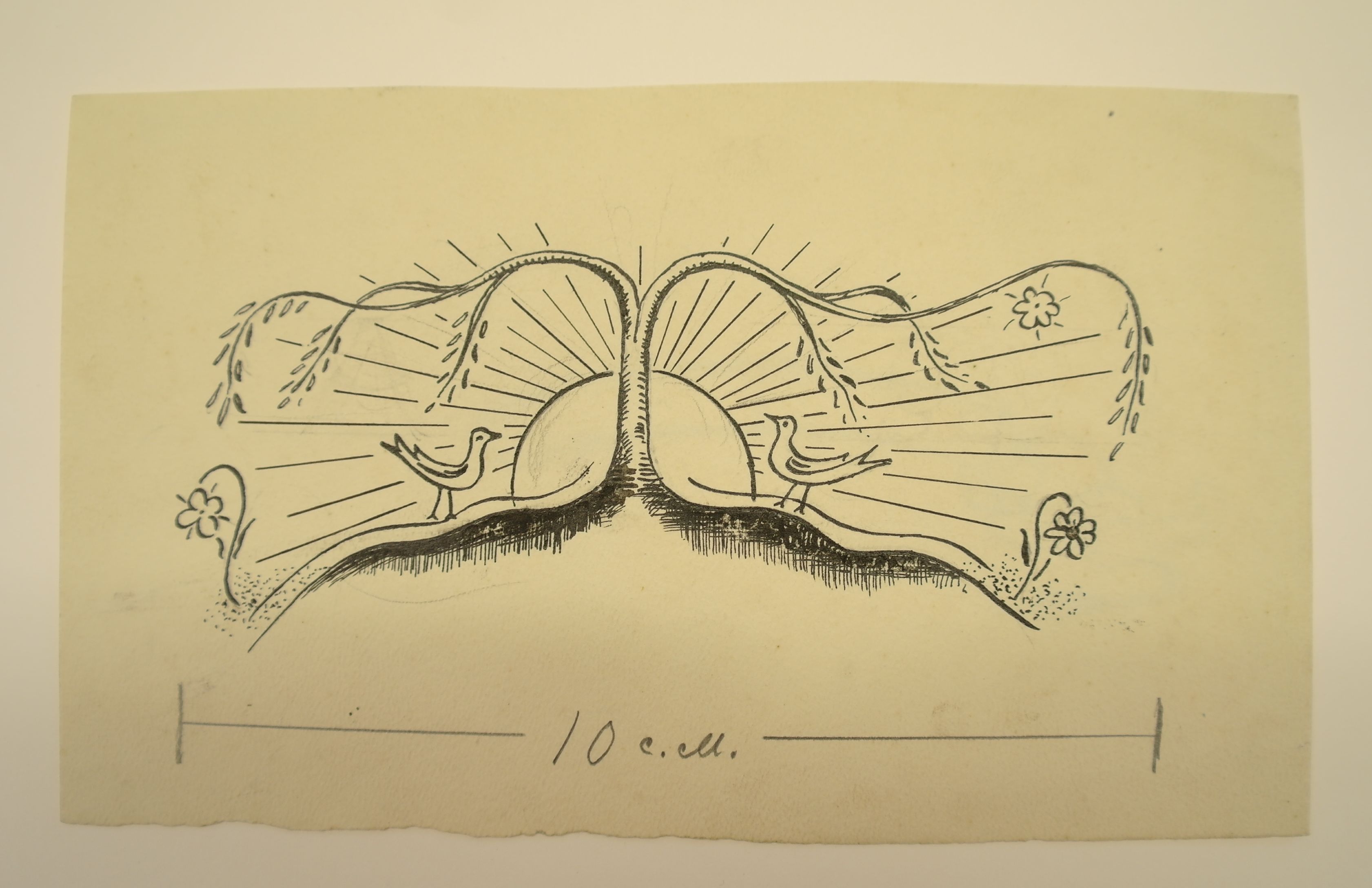 Tekening van boom en twee vogels aan weerszijden, op de achtergrond een zon. Op de achterzijde: tekening van vaandel.