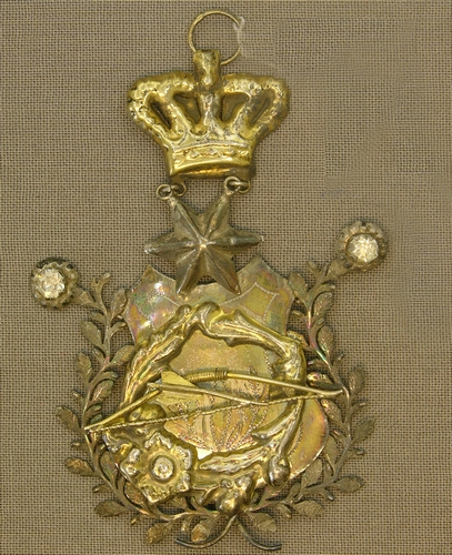 Prijspenning handboogvereniging - 1921, materiaal: metaal, afmetingen 8 x 5,5 cm, opschrift: '9e prijs Vreugde zij ons doel Zeelst 15-22-5-21'
