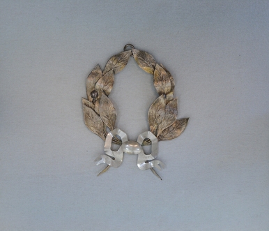 Lauwerkrans Burgerwacht Moergestel - 1934, materiaal: zilver of verzilverd metaal, afmetingen: 14,5 x 11,5 x 1,5 cm, krans van 14 lauriebladeren met twee knoppen en onderaan een symmetrisch gevormd banderole-lint met het inschrift: '8 PR. KORPS B.W. MOERGEST. 1-7-'34' opschrift: 8 PR. KORPS B.W. MOERGEST. 1-7-'34