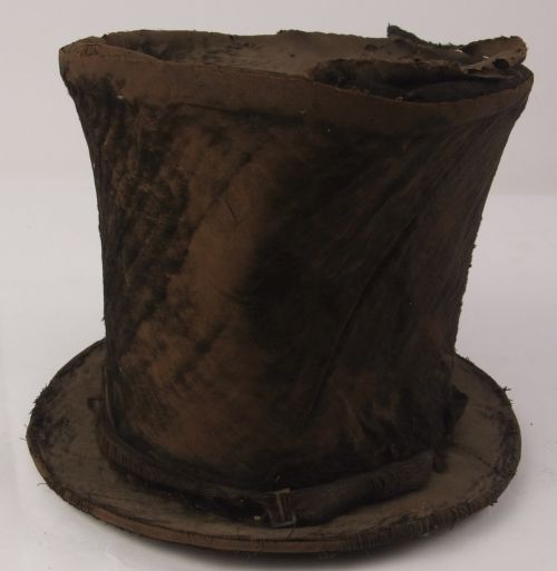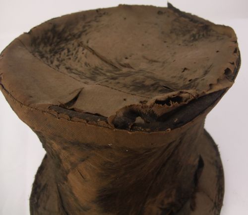 Hoge hoed, gevoerd met vilt. Riempje met metalen gesp.
