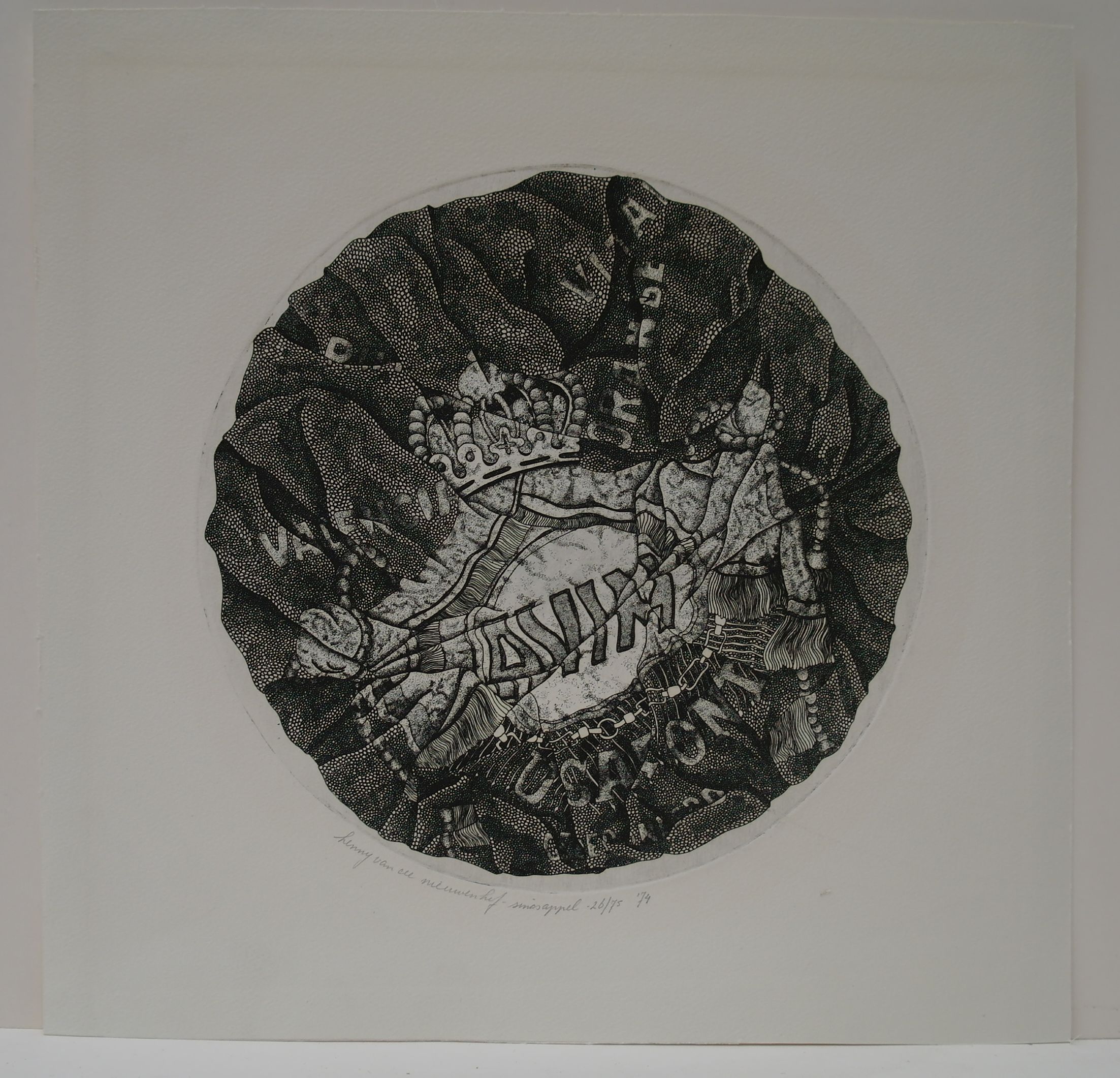 in lijst achter glas oud gemeente nummer F 370 gesigneerd, getiteld, genummerd en gedateerd in potlood onder plaat: henny van de nieuwenhof-sinasappel-26/75 '74