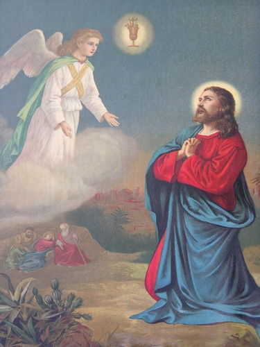 Polychromolithografie met voorstelling van Jesus Christus in de Hof van Olijven, Christus in biddende houding geknield, Links een naderende engel. 375 x 245 mm, geplakt op karton Chromolithografie met voorstelling van Jesus Christus in de Hof van Olijven, Christus in biddende houding geknield, Links een naderende engel. 375 x 245 mm, geplakt op karton