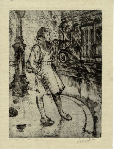 Meisje in de regen - z.j., ets/papier, 257 x 188 mm, gesigneerd onder plaat in potlood r.o.: Harry Maas, geannoteerd onder plaat in potlood l.o.: meisje in de regen, HN-nr M1-096
