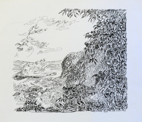 Suriname (landschap) – 1972, oostindische inkt en viltstift/papier, 260 x 290 mm, gelocaliseerd, gedateerd en gesigneerd r.o.: Suriname 1972 H. JAN SCHOUTEN