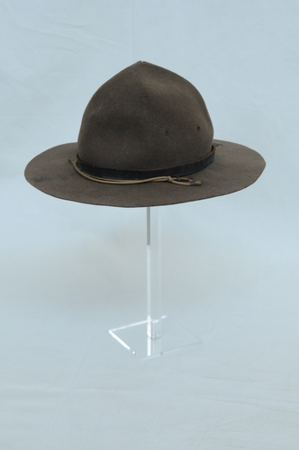 Padvindershoed - 1946, materiaal: vilt, katoen en leder, kleur: beigebruin (khaki), hoogte 13 cm, lengte 34 cm, breedte 31 cm, lederen hoedenband met gesp, een katoenen veter om hoed onder kin te bevestigen. vier nestelgaatjes in de bol, een lederen binnenband, ingebrand vignet: boompje 1946 'De Klus'