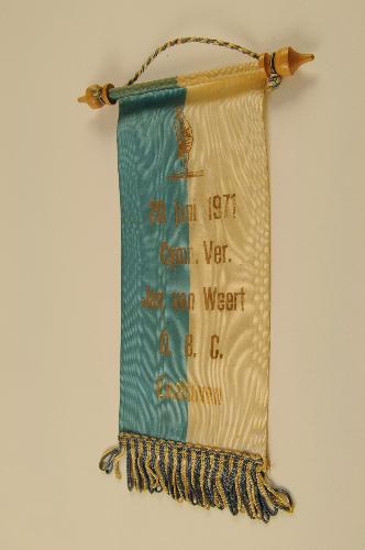 Vaantje van gymnastiekvereniging – 1971, materiaal: kunstzijde, afmetingen: 28 x 10,5 cm, breedte incl. draaghoutje 16,5 cm, blauwwit verticaal gebaand vaantje met draaghoutje en koordje en in vergulde letters de opdruk: ‘Gymn. Ver. / Jan van Weert / O.B.C. / Eindhoven’, bovenaan de afbeelding van een figuurtje in turnstand op één hand met gestrekte linkerarm ...