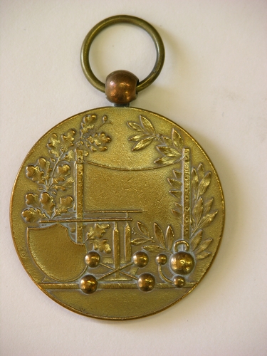 Ronde prijsmedaille/draagpenning met recto: reliëfafbeelding van gewichten, (turn)bruggen en hoogspring-bok met leeg schildje/veldje tussen lauwertakken van eikenblad en laurier. Merktekentje in wapenveld. Verso: inschrift '3e Pr. Driek. Gymn. Adsp. turners Eindhoven 9-5-'29', gevat tussen lauwertakken van laurierblad en eikenblad. Met doorboord knopje/draagringetje
