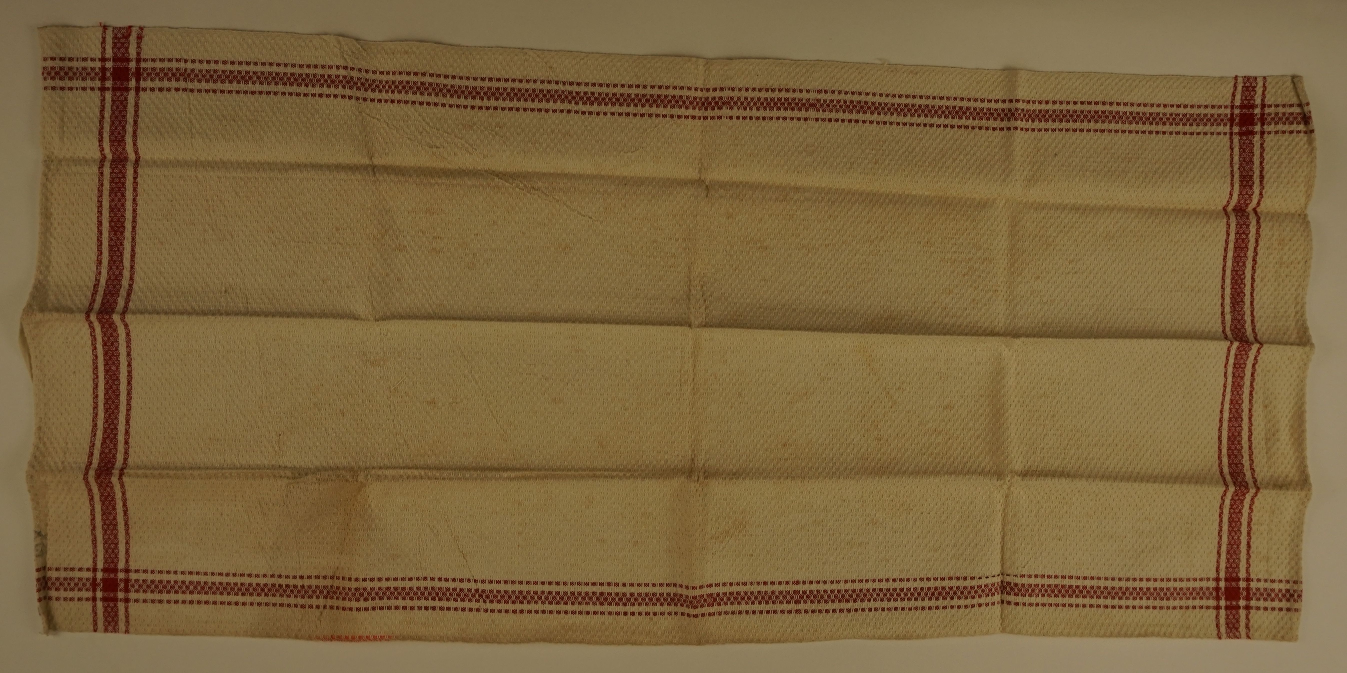 Handdoek, materiaal: katoen, kleur: ecru/rood, lengte 92 cm, breedte 43 cm, gerstenkorrel geweven, rondom rode strepen ingeweven, één lus