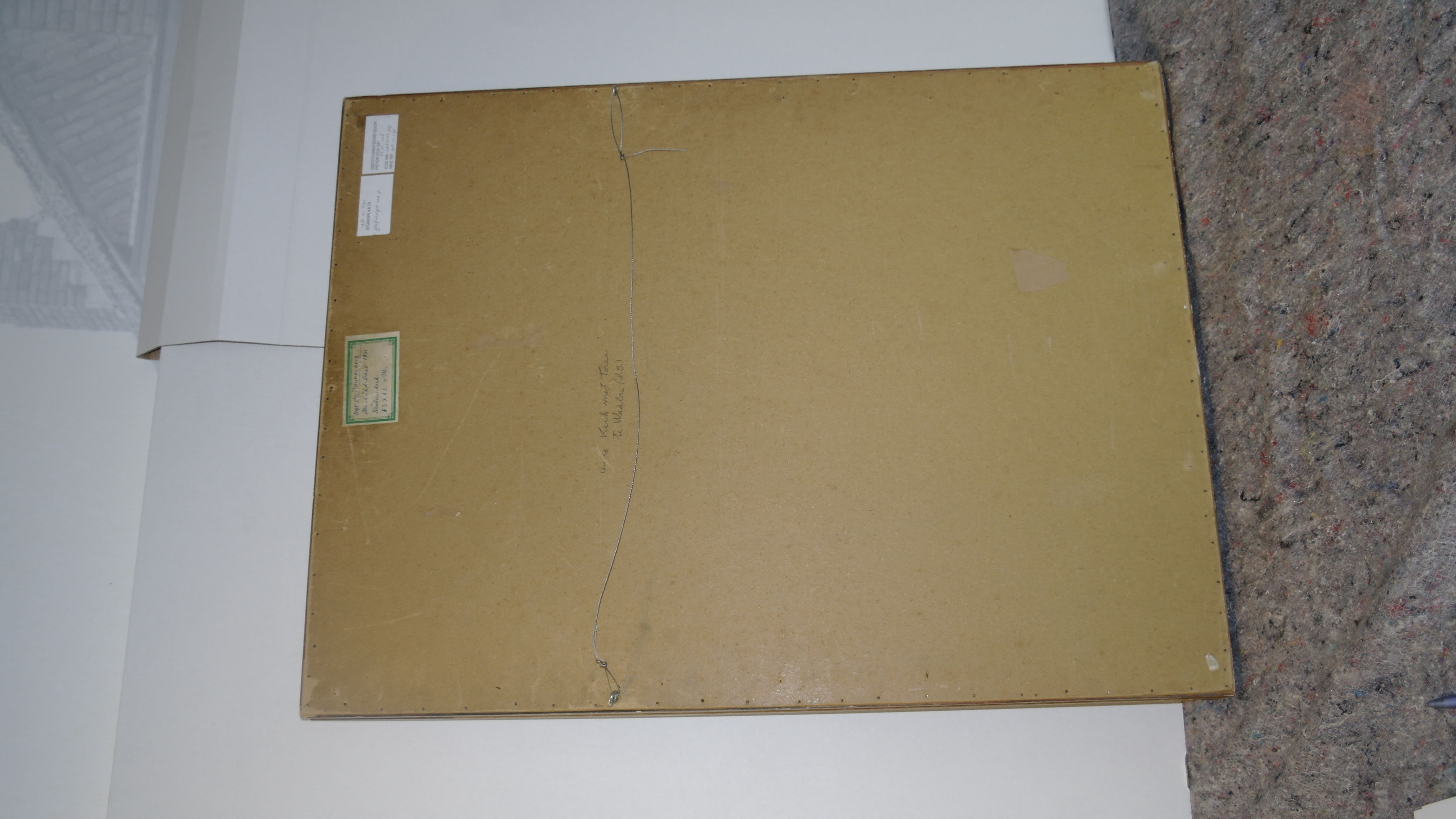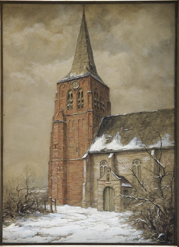 Oude kerk met toren te Waalre - 1939, pastelkrijt/karton, 770 x 550 mm, geannoteerd, gesigneerd en gedateerd r.o.: WAALRE Hendrik de Laat 1939