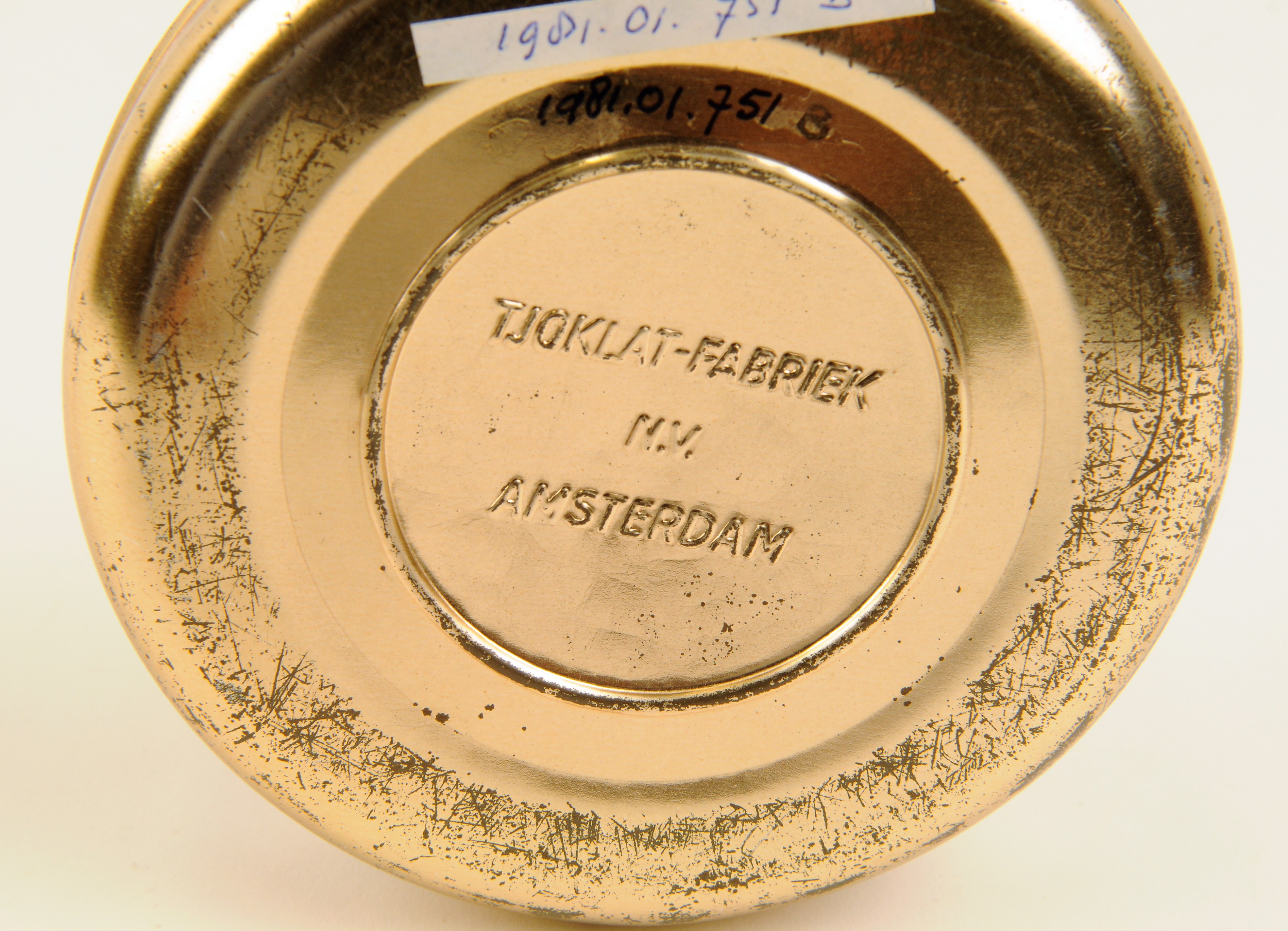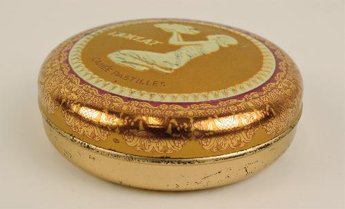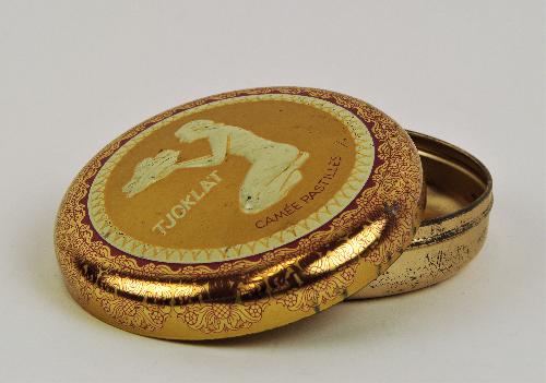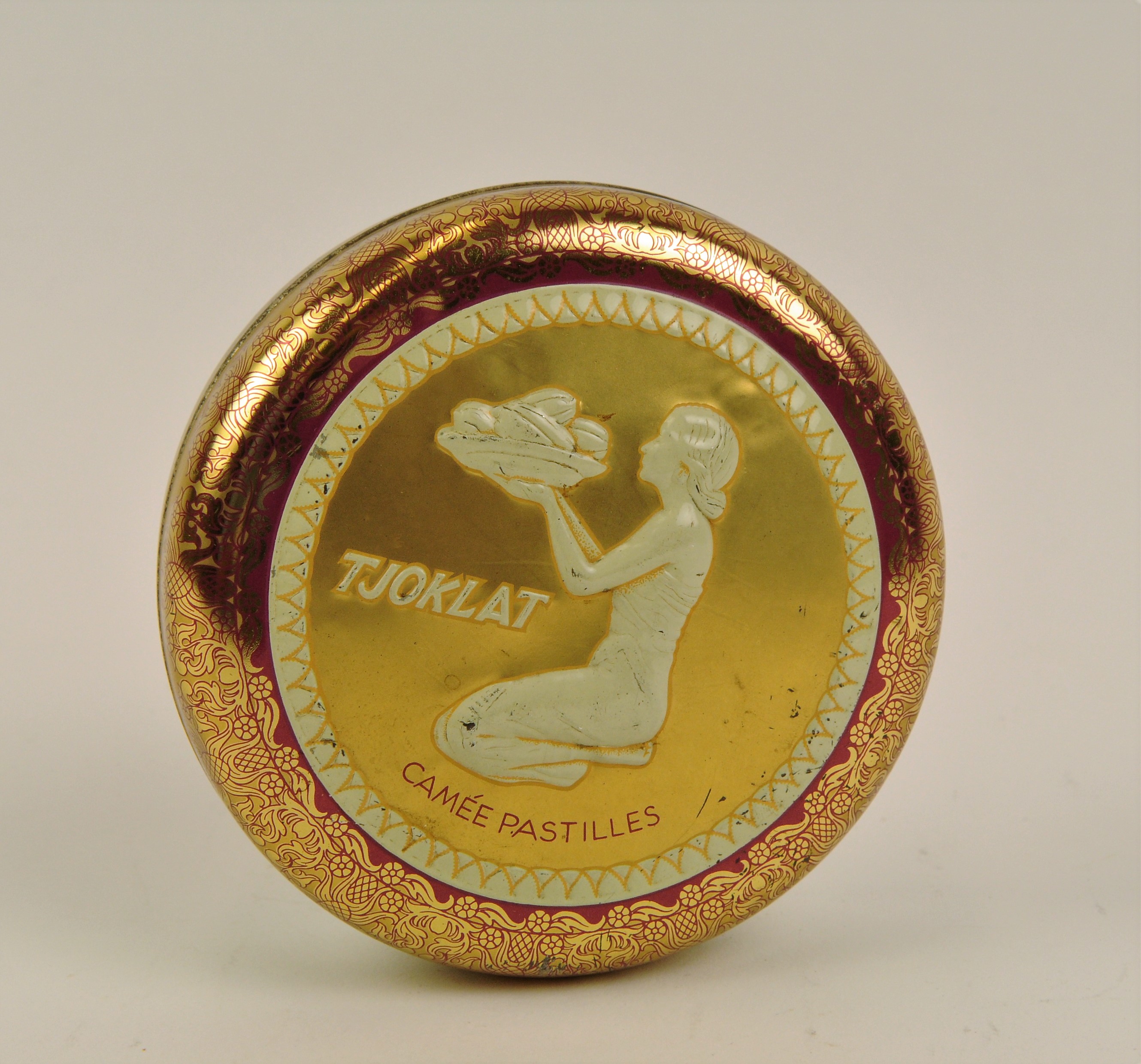 Rond blikje voor camée pastilles van het chocolademerk 'Tjoklat'. Op het deksel is een naar links gewende vrouwenfiguur afgebeeld die in in hurkzit een presenteerschaal vol chocolade in beide handen houdt.