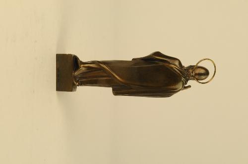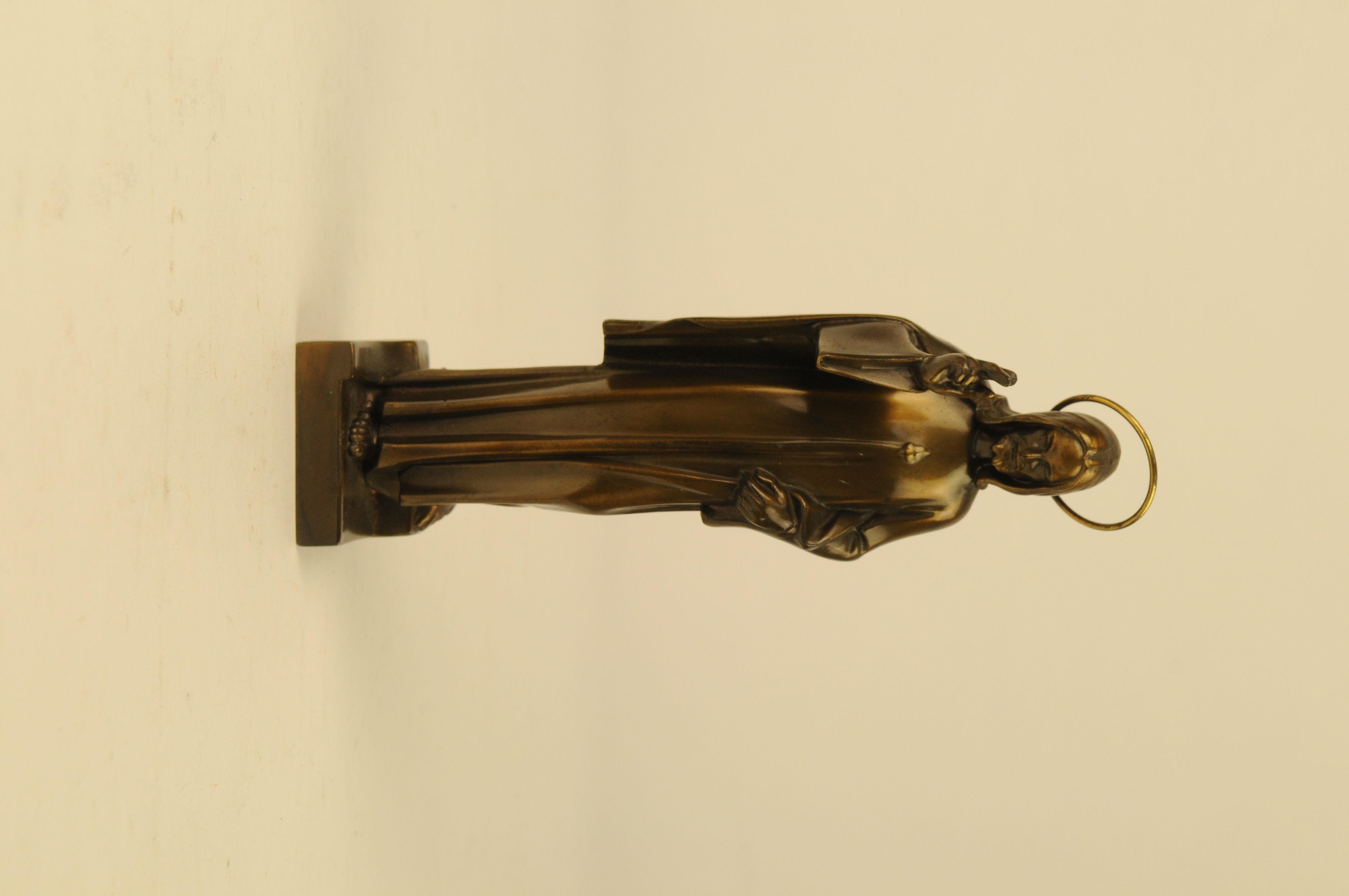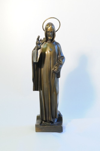 Staande Christusfiguur, de rechtervoet naar voren geplaatst, de linker naar achteren, rustend op een kleine verhoging, de rechterhand zegenend opgeheven, vlammend hart, wonde in linkerhand, ring-nimbus om het hoofd.
