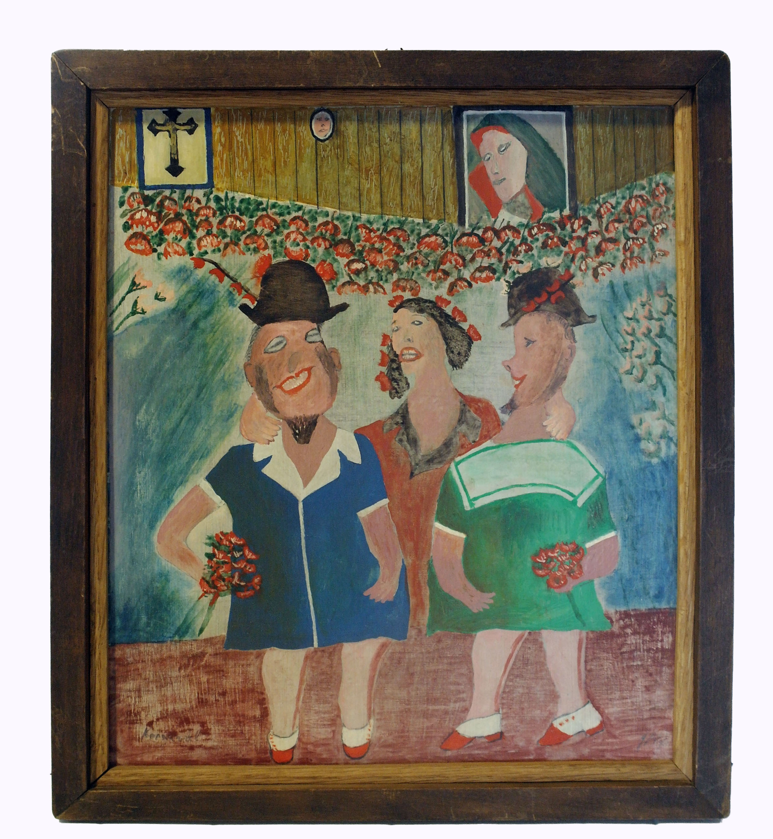 'Karnaval', olieverf op hardboard, 41,5 x 35 cm, gesigneerd r.o.: J. Strijbos, geannoteerd l.o.: Karnaval