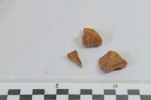 Eindhoven Ravensdonck 1985 Put IV vondstnr. 5, uit coupe van spoor 31, Twee brokjes baksteen en scherfje steengoed