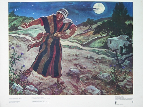 Schoolplaat 'Parabel van het onkruid tussen de tarwe', Bellarminus Bijbelplaten-serie no.41, gesigneerd in voorstelling r.o.: Frans van Noorden, onder de voorstelling het opschrift: Een vijandig mens heeft dit gedaan (Mattheus 13: 28) app. eccl. Ultr. 26-10-1954