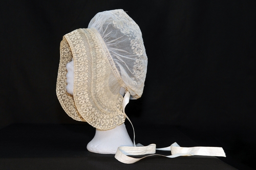 Speldenmuts, materiaal: tule en kant, kleur: wit, lengte 31,5 cm, breedte 34 cm, één groot geborduurd patroon op de bol, tussenstukje van gekloste kant, geklost laddertje, spelden aan de voorkant rondom in muts gezet Type muts is afkomstig uit West-Brabant