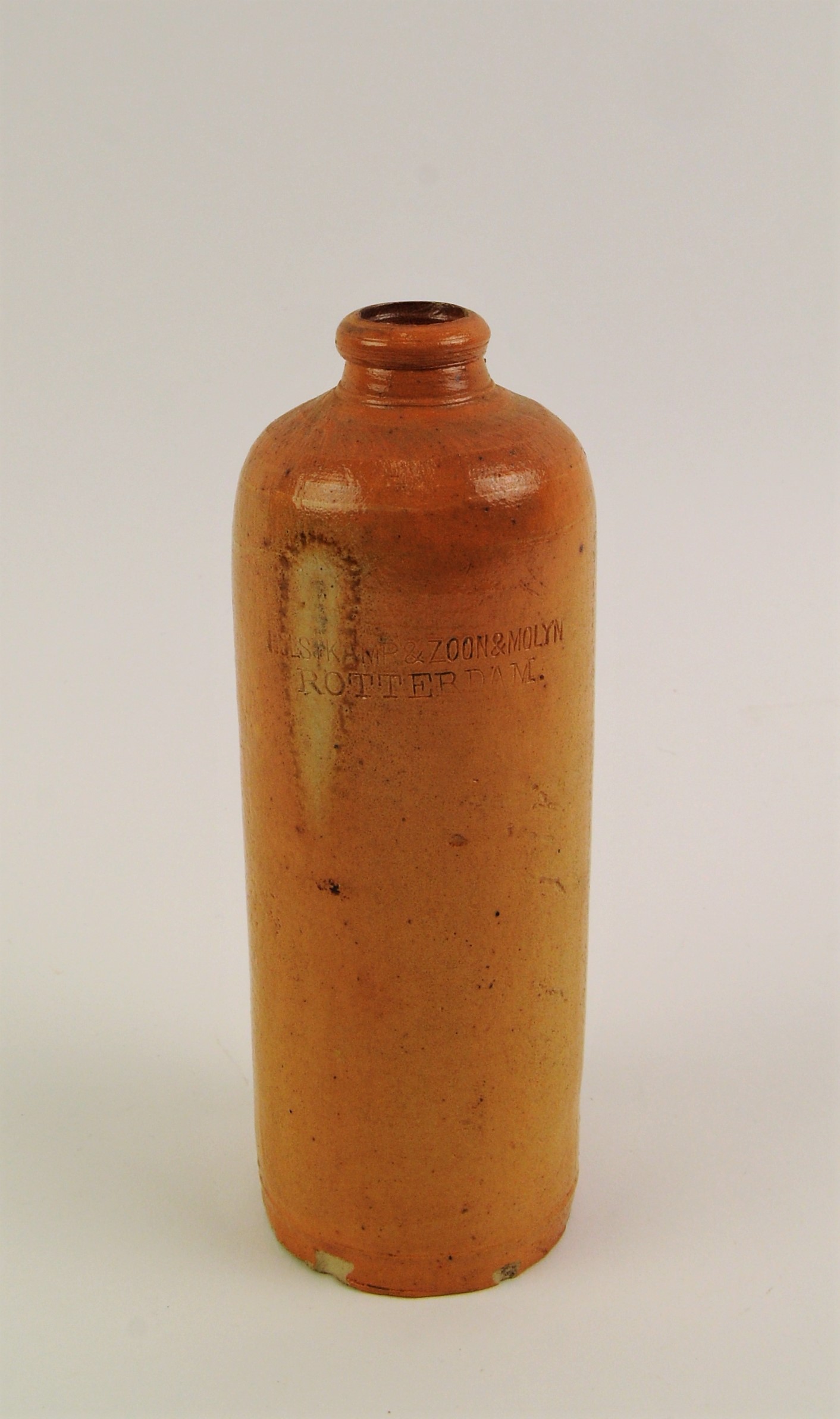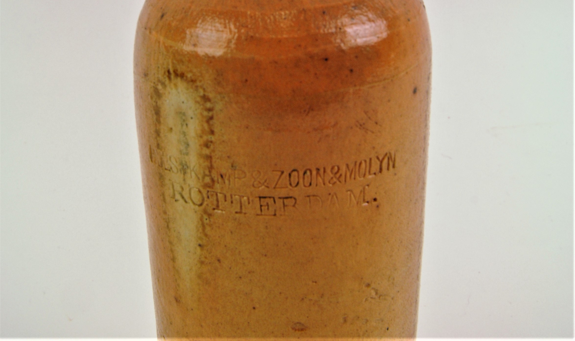 Aardewerken kruikje voor gedistilleerd of brandewijn met het stempel: 'HULSKAMP & ZOON & MOLYN ROTTERDAM'