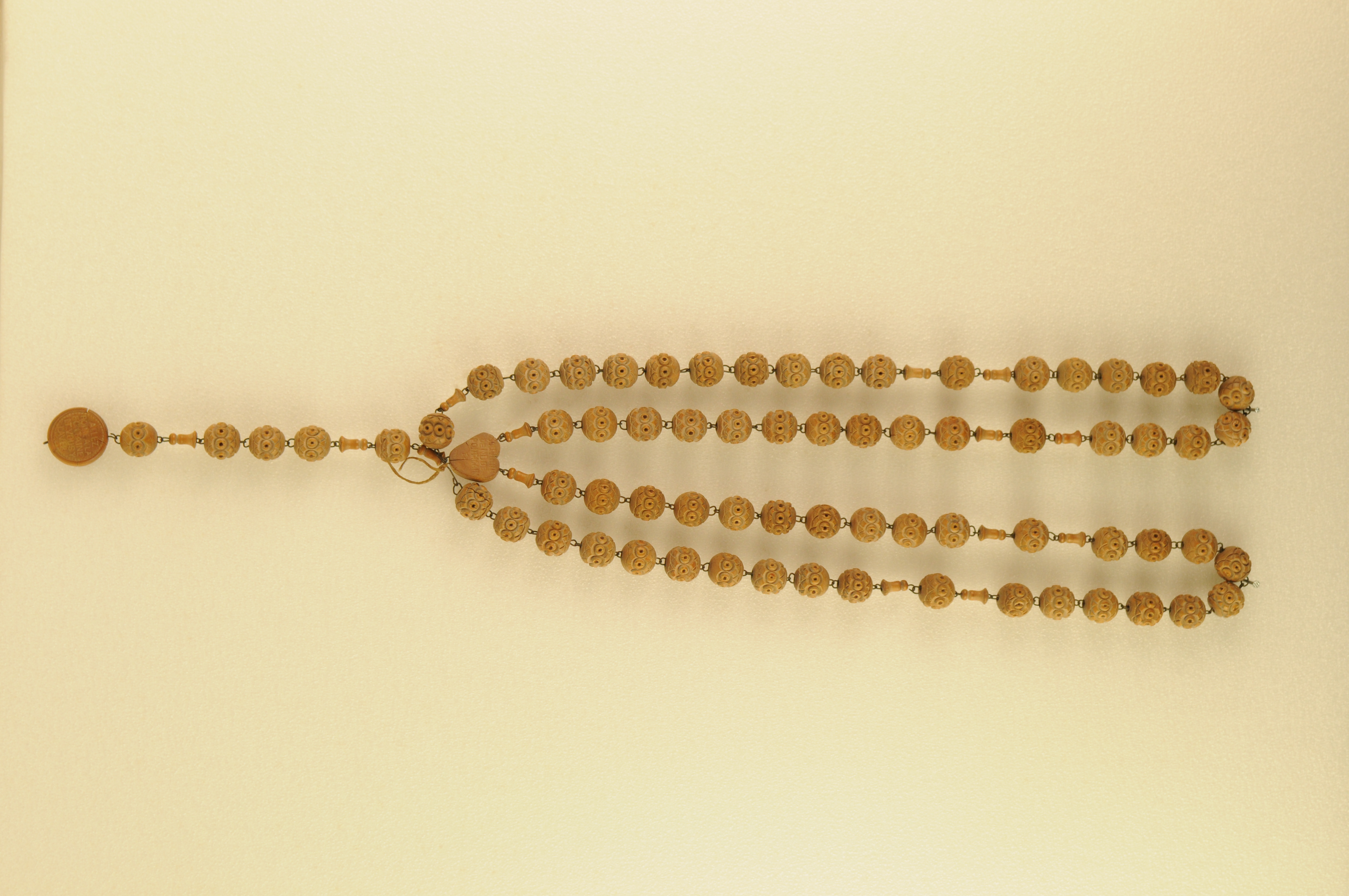 Rozenkrans bestaande uit metalen snoer waaraan houten kralen en een houten hartje met inscriptie: coeur immaculale de Marie protegez nous, souvenir de N.D. de Pont-Mair.