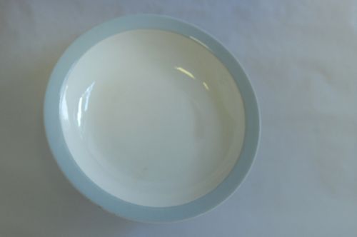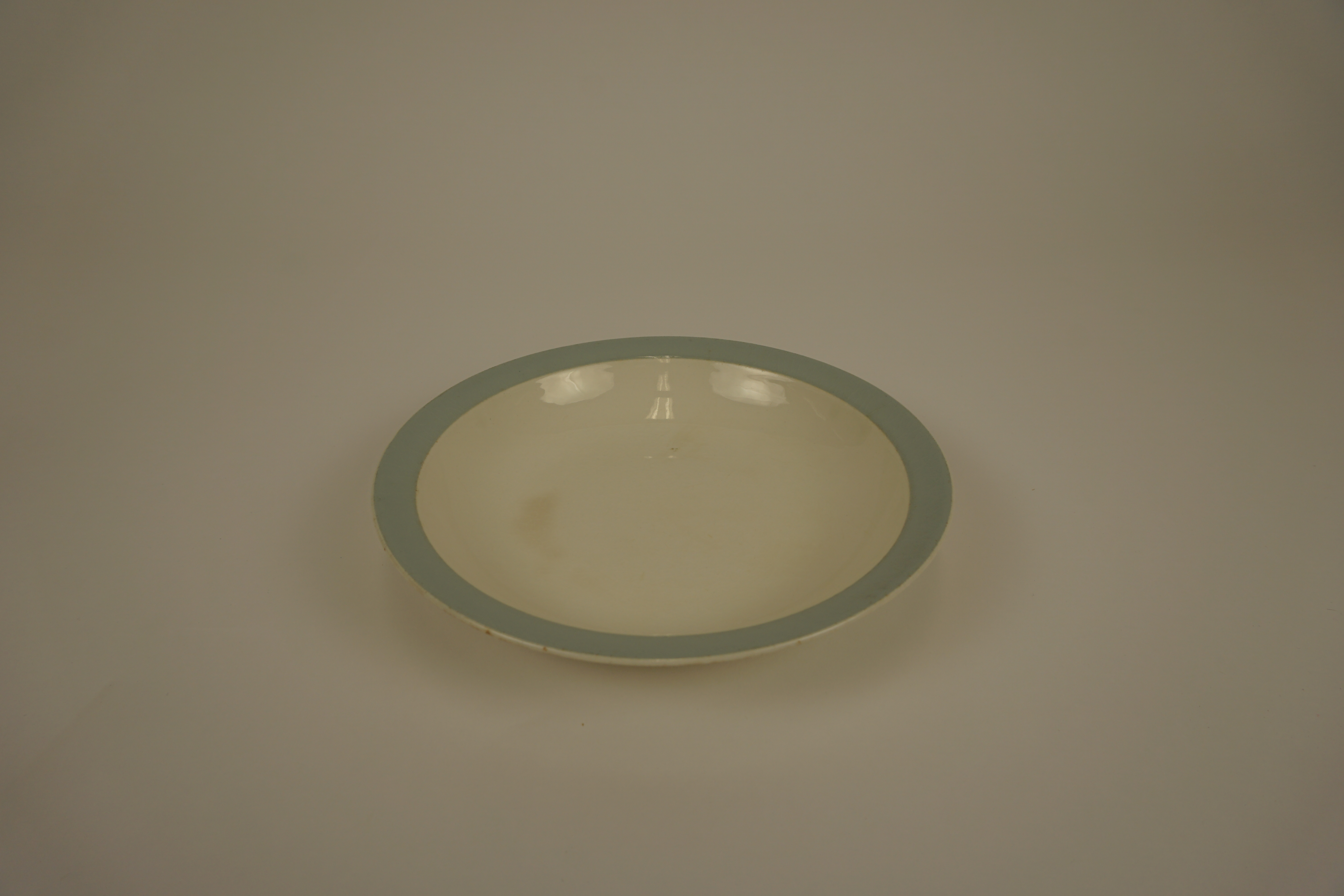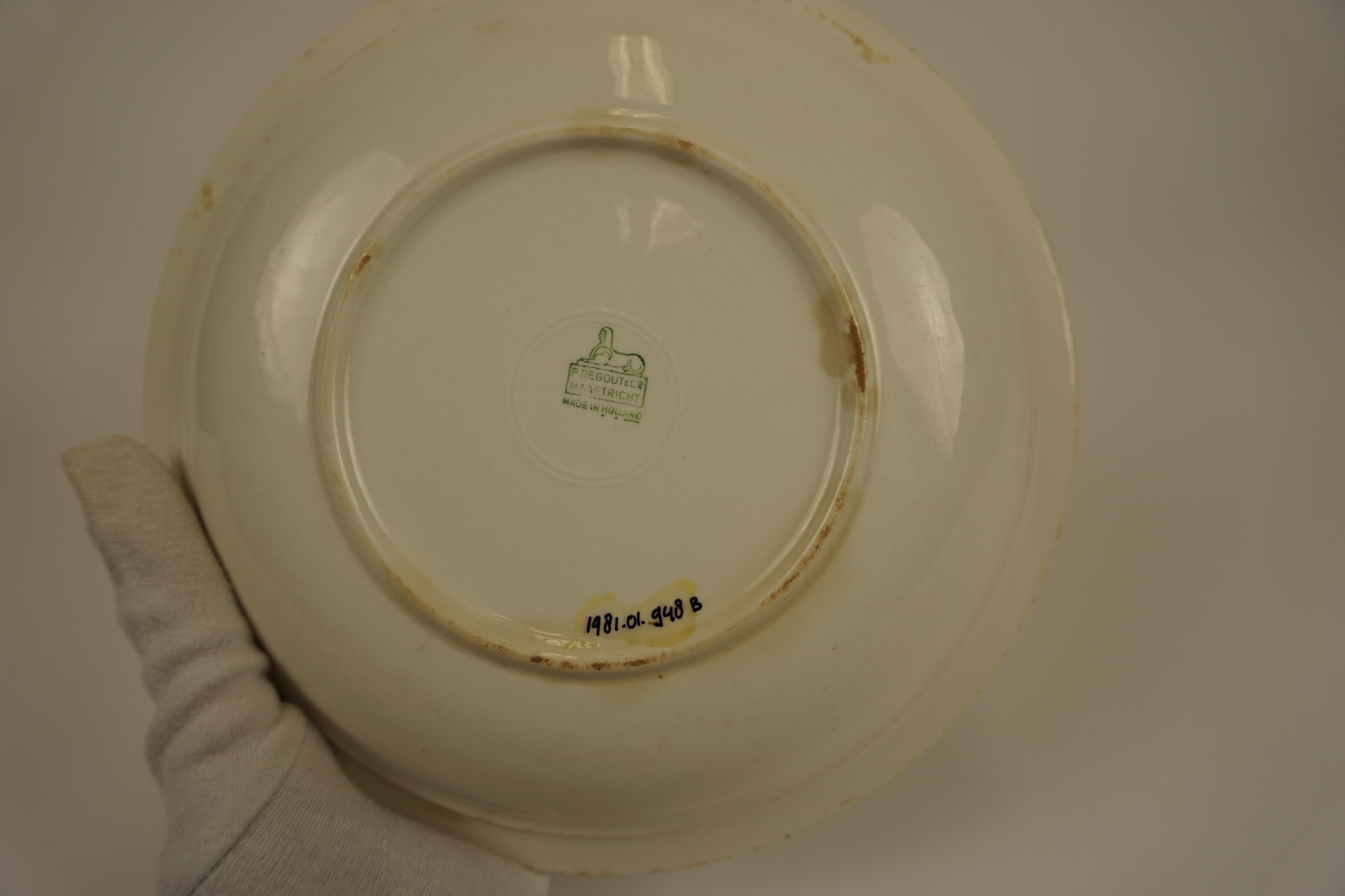 Bord - eerste helft van de 20e eeuw, witbakkend geglazuurd aardewerk, afmetingen: 4 x 22 cm, diep bord met een grijs-blauwe rand, op de onderzijde van de bodem gemerkt: 'P. REGOUT & CO MAASTRICHT MADE IN HOLLAND' gemerkt: P. REGOUT & CO MAASTRICHT MADE IN HOLLAND