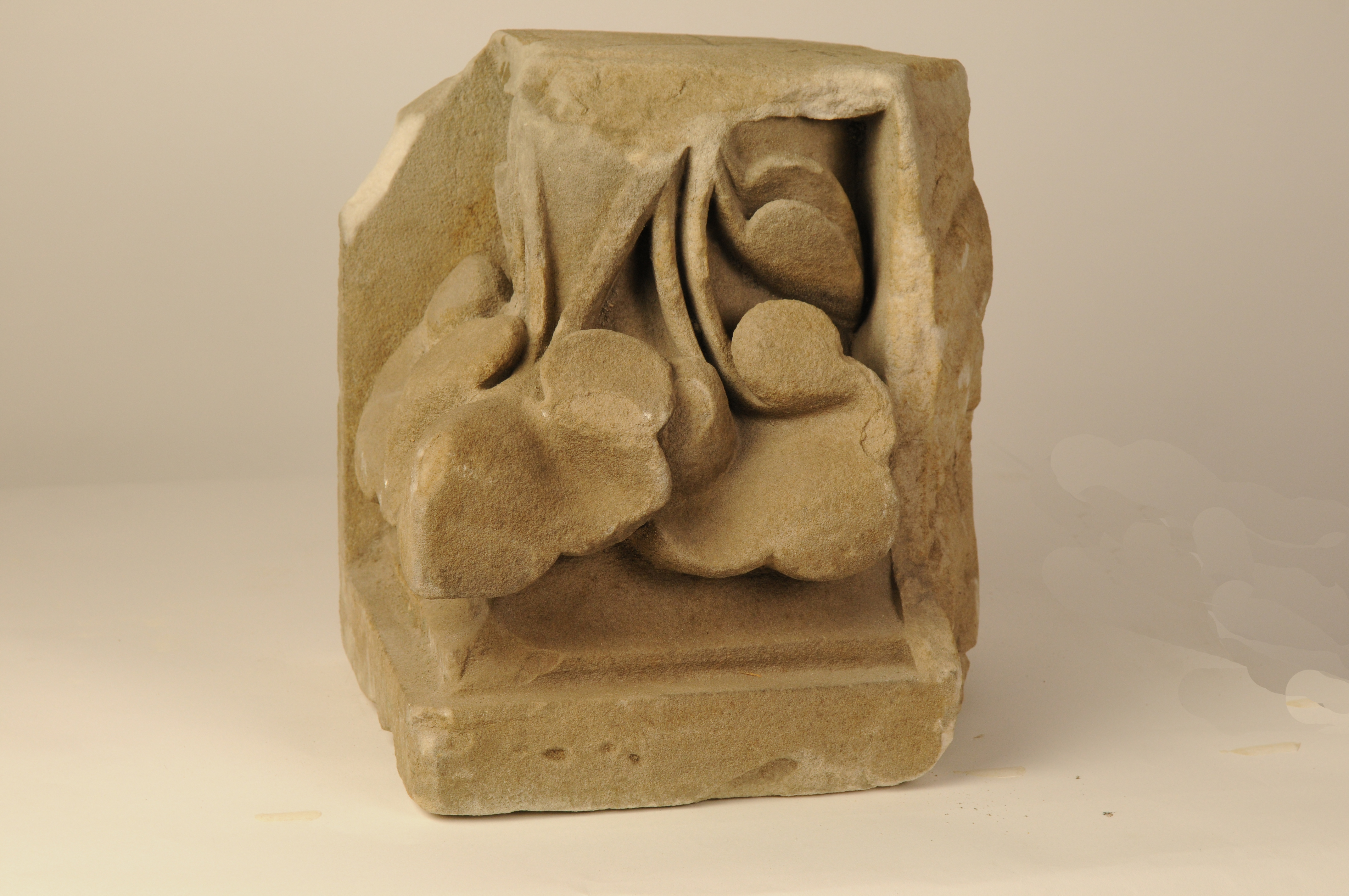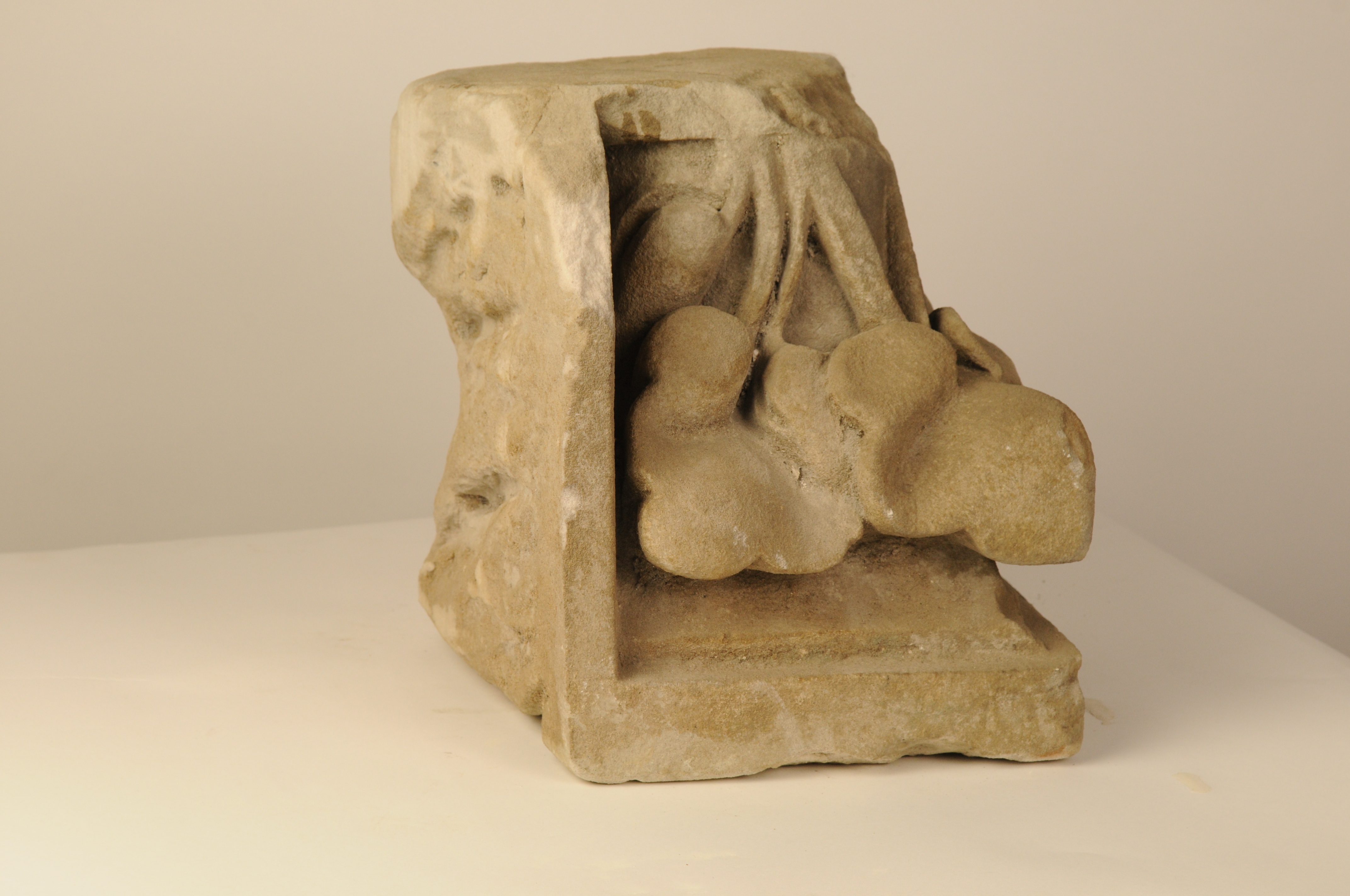 Kalkstenen hoekkapiteel uit een van de drie ingangsportalen van de Eindhovense Catharinakerk.