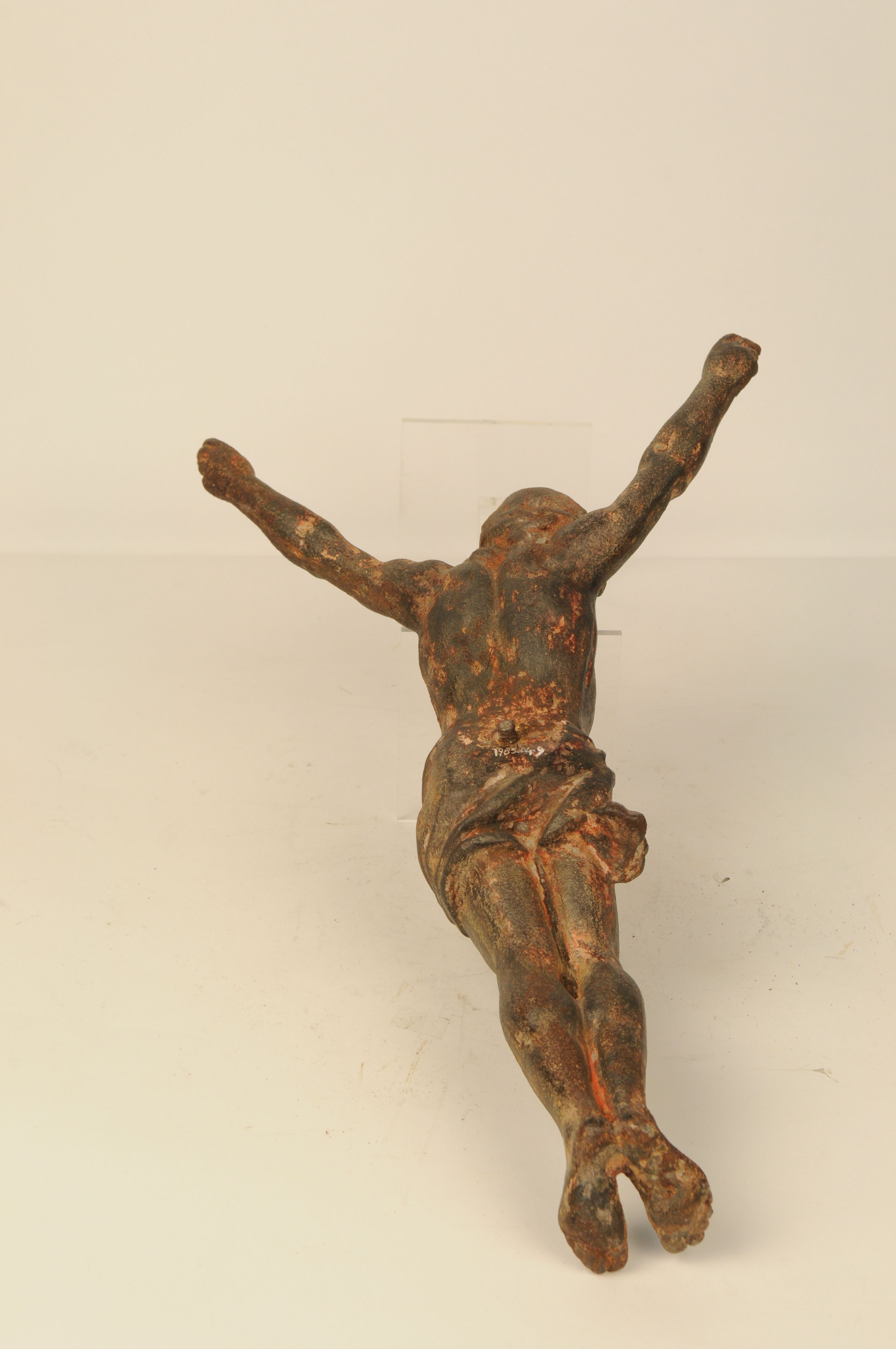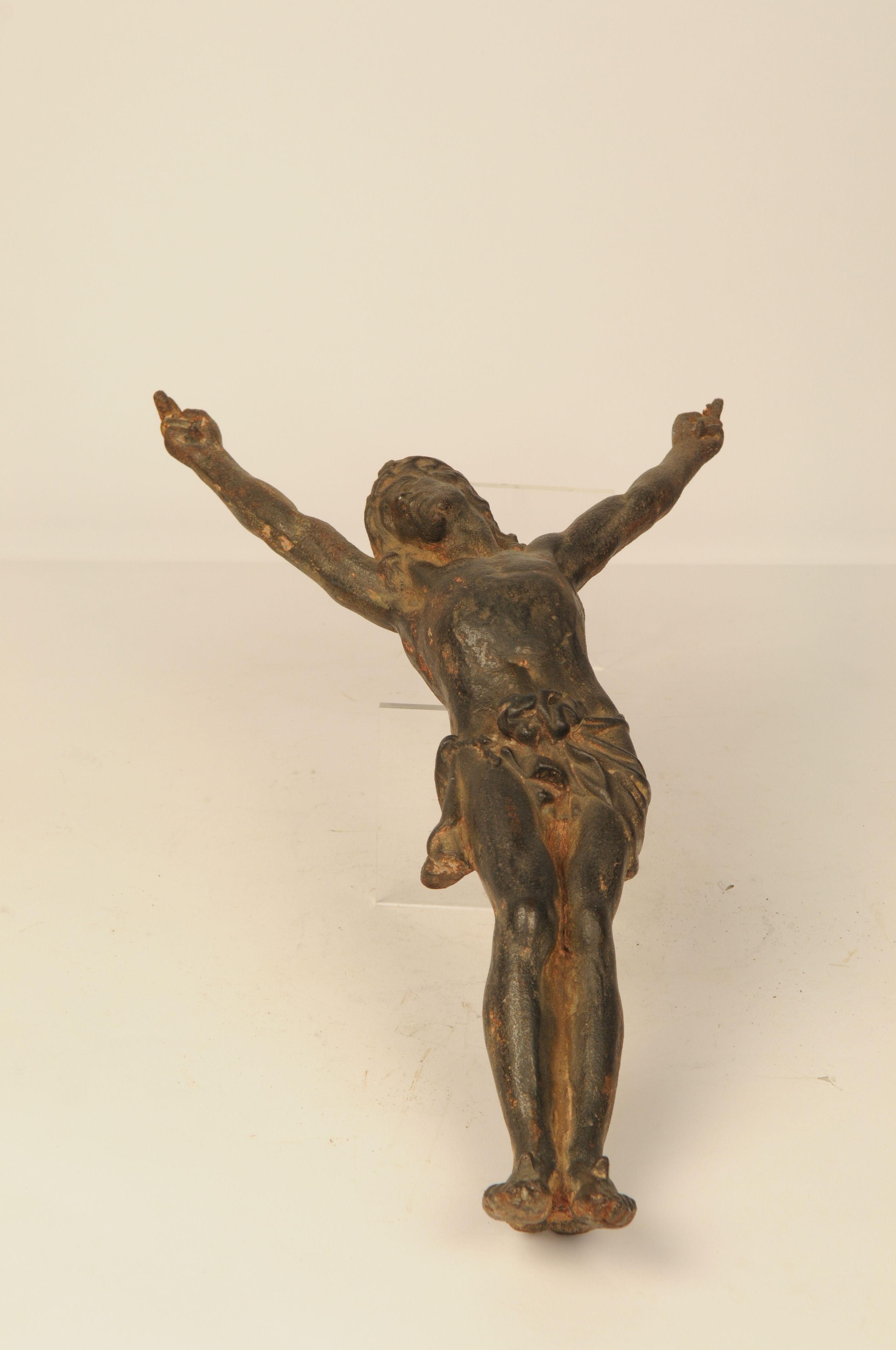 Gietijzeren Christuscorpus, vermoedelijk afkomstig van een grafkruis. Lendendoek geknoopt op navelhoogte. Voeten naast elkaar genageld. Middel- en wijsvinger opgestoken.