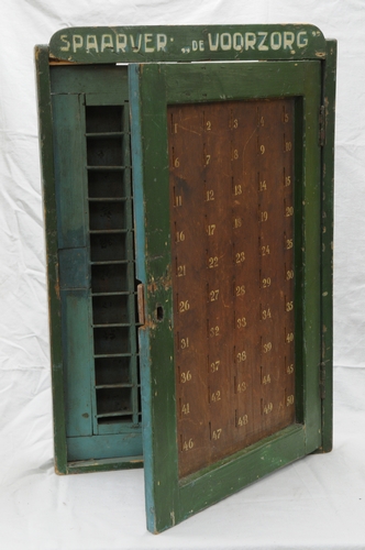 Groen beschilderd hangkastje met scharnierend deurtje waarin 50 gleufjes genummerd 1 t/m 50 die corresponderen met vijftig ondiepe achterliggende vakjes binnenin. opschrift bovenrand: 'SPAARVER. 'DE VOORZORG'' Deze spaarkast werd ook wel de 'Dubbeltjespot' genoemd