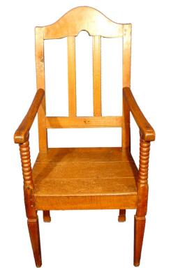 Houten stoel met hoge open rugleuning met spijlen, armleuningen en houten zitvlak. Armleuningen rusten op getorste steunen aan de voorzijde
