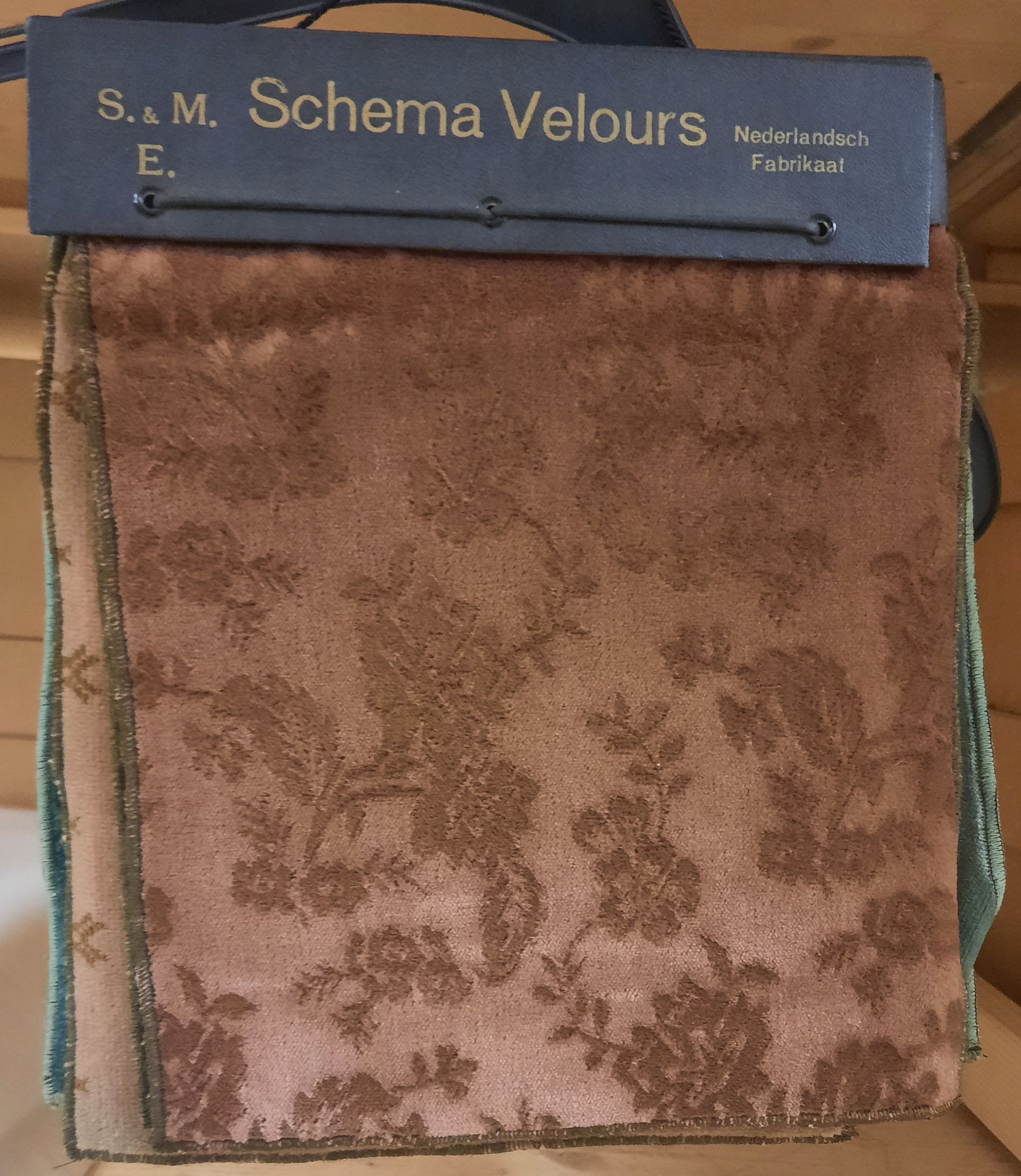 Stalenboek met gedessineerd velours, materiaal: karton en velours, lengte 33 cm, breedte 26 cm, bestaande uit een harde kaft met drie nestelgaten en koord waartussen 11 stalen gedessineerd velours, opdruk: S&M E Schema Velours nederlandsch fabrikaat, omstreeks 1960