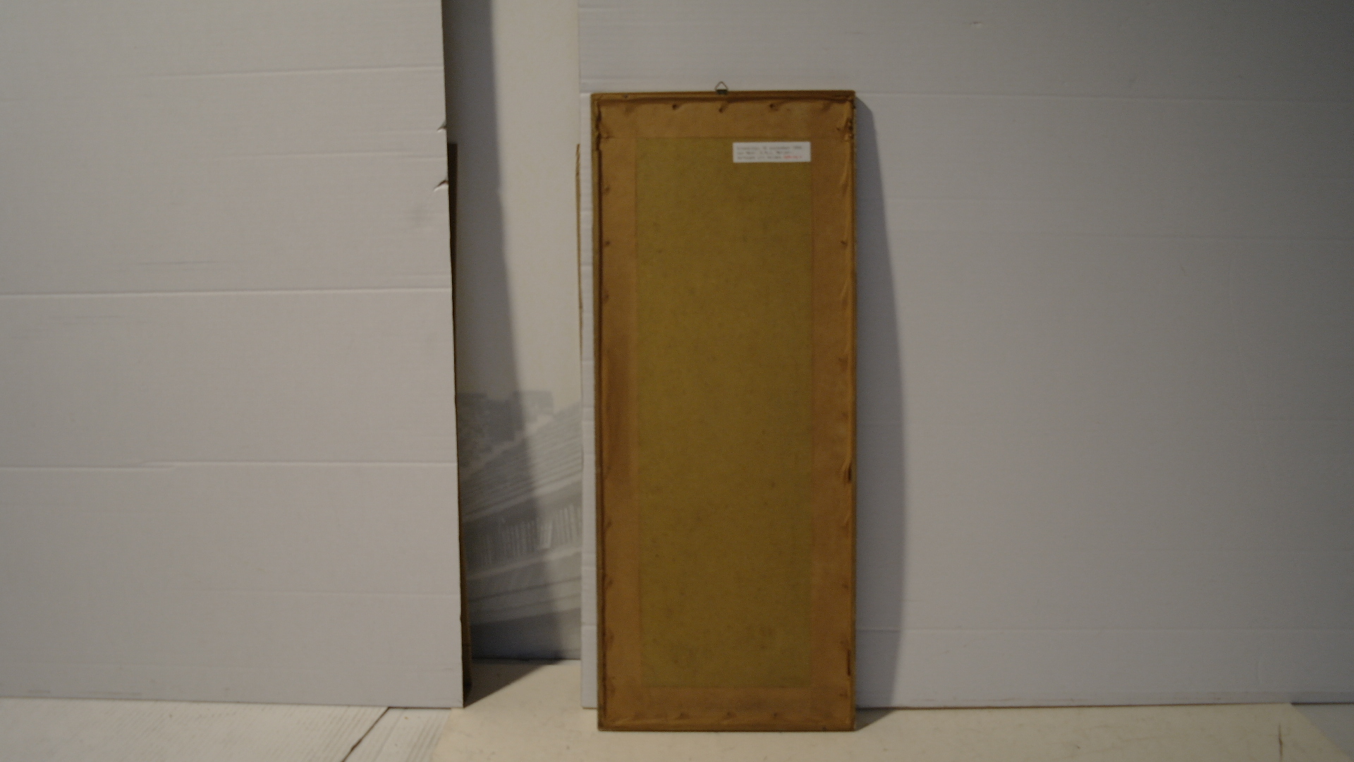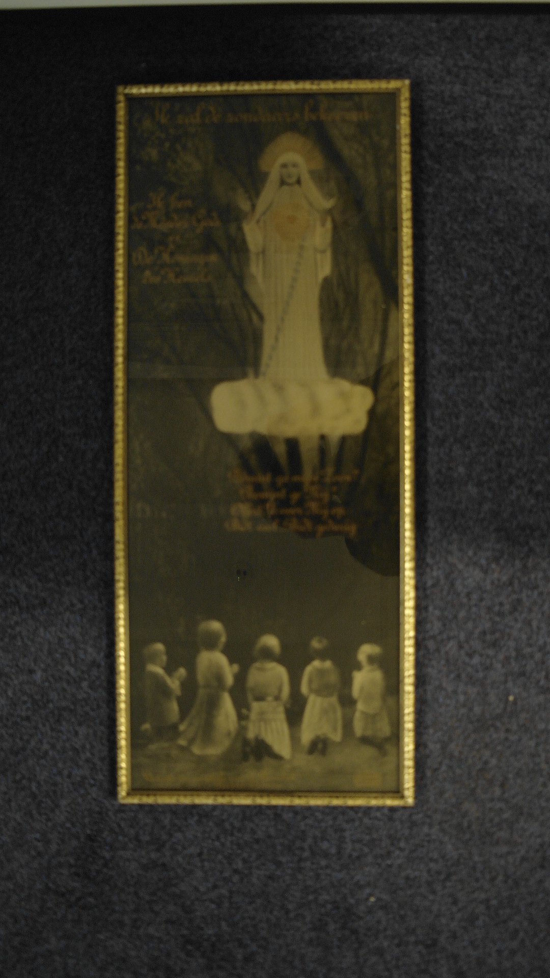 Tekst; Ik zal zondaars bekeeren/ Ik ben de moeder Gods/ De Koningin des Hemels/ Bemint ge mijn Zoon?/ Bemint ge mij?/ Offert U voor Mij op/ Bidt veel - bidt gedurig/ Afbeelding; boven: Maria voor bomen onder: Vijf kinderen op de rug gezien. Gemerkt r.o.: PAQUIR FLAWINE, In lijst achter glas