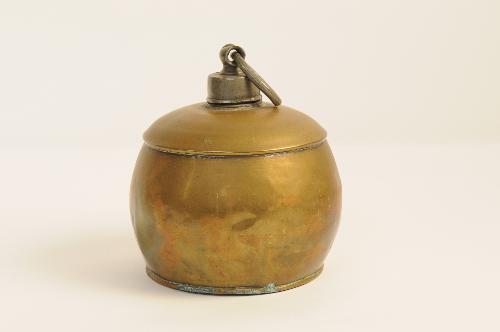 Messing warmwaterkruik met tinnen schroefdop, waaraan scharnierende ring als hengsel. Cilindrische vorm.
