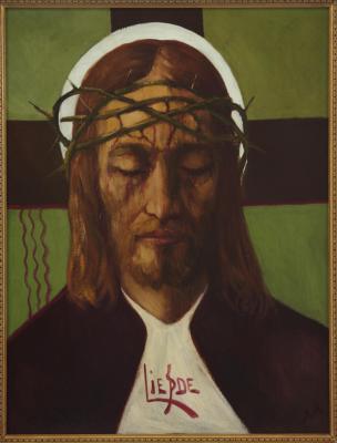 Christus met doornenkroon - z.j., olieverf/paneel, 66 x 50 cm, gemonogrammeerd r.o.: X X , geannoteerd m.o.: Liefde Portret, frontaal/en face, van Christus met aureool en doornenkroon, bloed op voorhoofd en glaat, de ogen neergeslagen, kruis op de achtergrond.