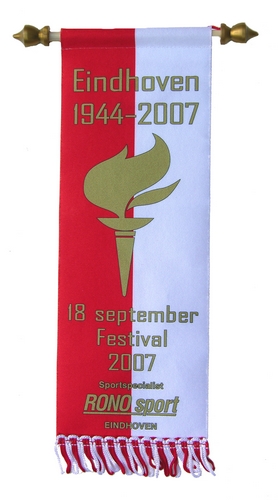Vaantje, materiaal: textiel, hout en kunststof, kleur: rood-wit gebaande ondergrond, 29 x 10 cm, opdruk: ‘ Eindhoven 1944 – 2007 18 September Festival 2007’, afbeelding van een brandende fakkel, sportspecialist Rono Sport Eindhoven, draagstokje met kunststof uiteinden : 16,5 cm