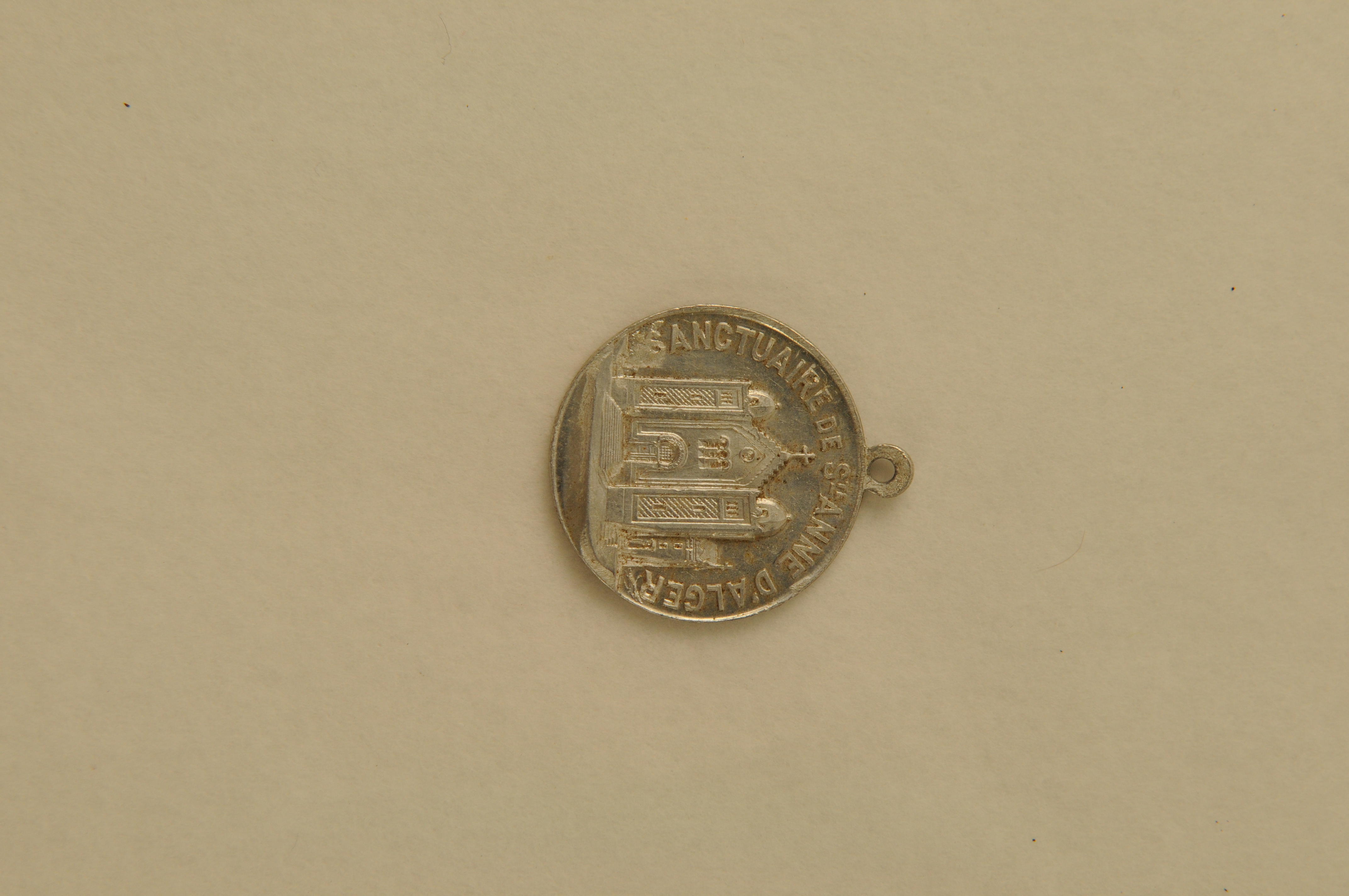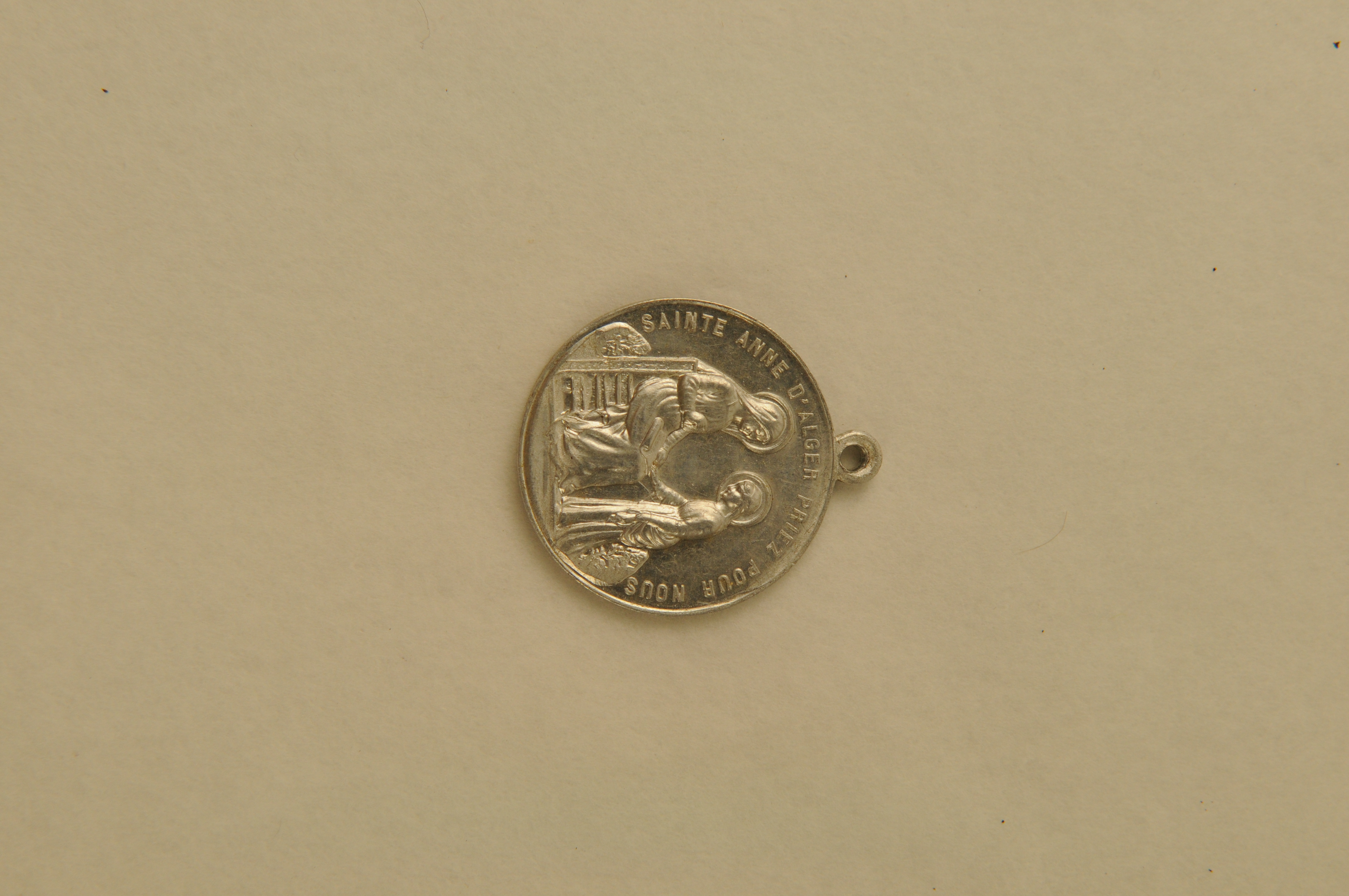 Religieuze medaille/draagpenning, materiaal: aluminium, ronde penning met aan vz. afbeelding van het heiligdom van St. Anna van Algiers met randschrift ‘SANCTUAIRE DE Ste ANNE D’ALGER’, kz. Anna in stoel gezeten met Maria en randschrift ‘SAINTE ANNE D’ALGER PRIEZ POUR NOUS’, 3 x 2,6 x 0,1 cm