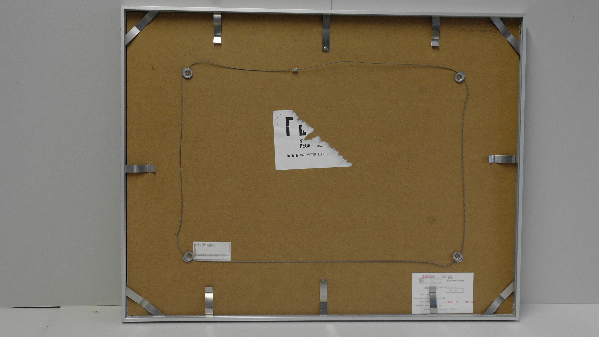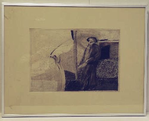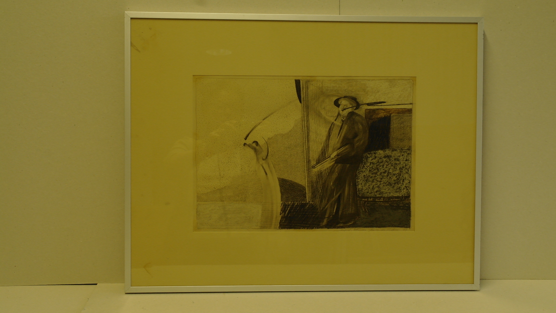 Dreigend – 1977, gemengde techniek/papier (potlood en pastelkrijt), 290 mm x 415 mm, getiteld, gelocaliseerd, gesigneerd en gedateerd in potlood onder voorstelling ‘dreigend; Montélimar Tom van der Linden ‘77’ herkomst GW 2116 (gemeente Eindhoven), in lijst achter glas