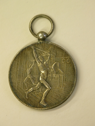 Ronde draagmedaille; prijspenning met doorboord knopje en draagringetje. Recto: reliëfvoorstelling van drie jongemannen bezig met sportoefeningen in gymzaal. Verso: Lauwertak van eiken- en laurierblad, waartussen inschrift '2e prijs Wielerclub Gemert 1909'