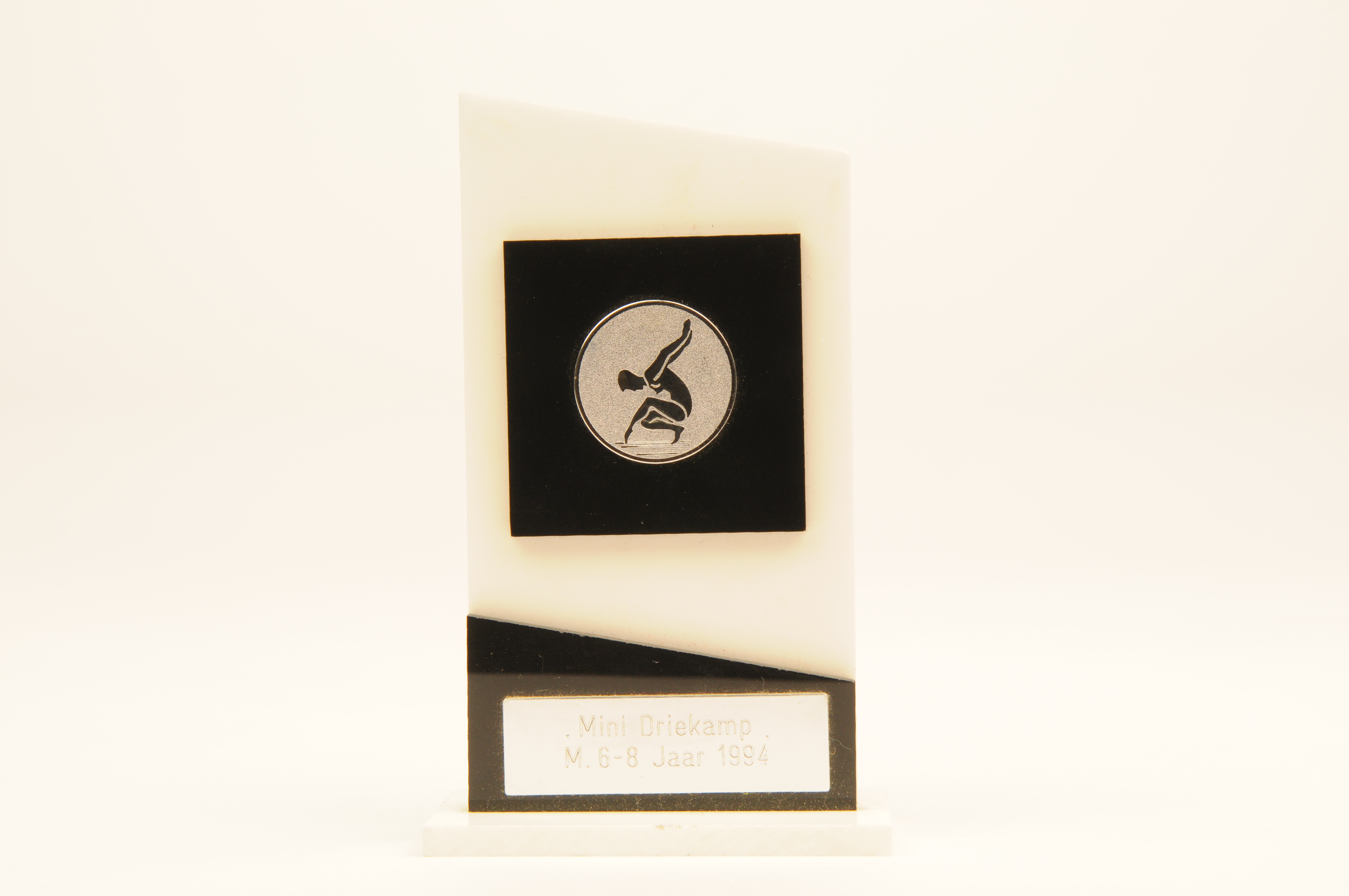 Prijstrofee Eindhovense Turnvereniging - 1994, standaardje met medaillon waarop turnfiguurtje en tekstplaatje: 'Mini Driekamp M. 6 - 8 Jaar 1994' Prijstrofee Eindhovense Turnvereniging - 1994, materiaal: metaal en kunststof, afmetingen: 11,5 x 7 x 3 cm, standaardje met medaillon waarop turnfiguurtje en tekstplaatje: 'Mini Driekamp M. 6 - 8 Jaar 1994'