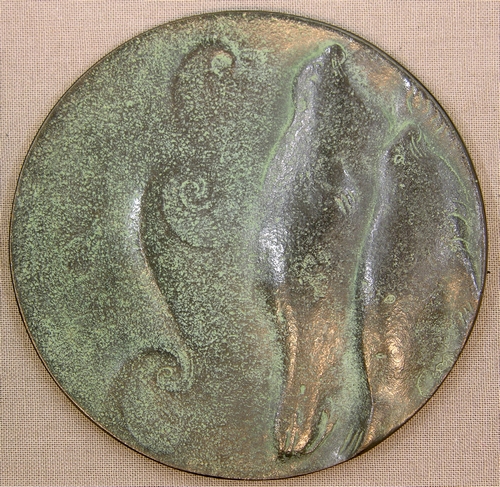 Vz. Twee zeehonden liggend op buik in de branding, kz. Drie zeehonden ondersteboven zwemmend in woelige zee, brons diam. 95 mm Vz. Twee zeehonden liggend op buik in de branding, kz. Drie zeehonden ondersteboven zwemmend in woelige zee, brons diam. 95 mm Verworven door K. Heins in 1991 bij de kunstenares thuis, die toen in Amsterdam ...