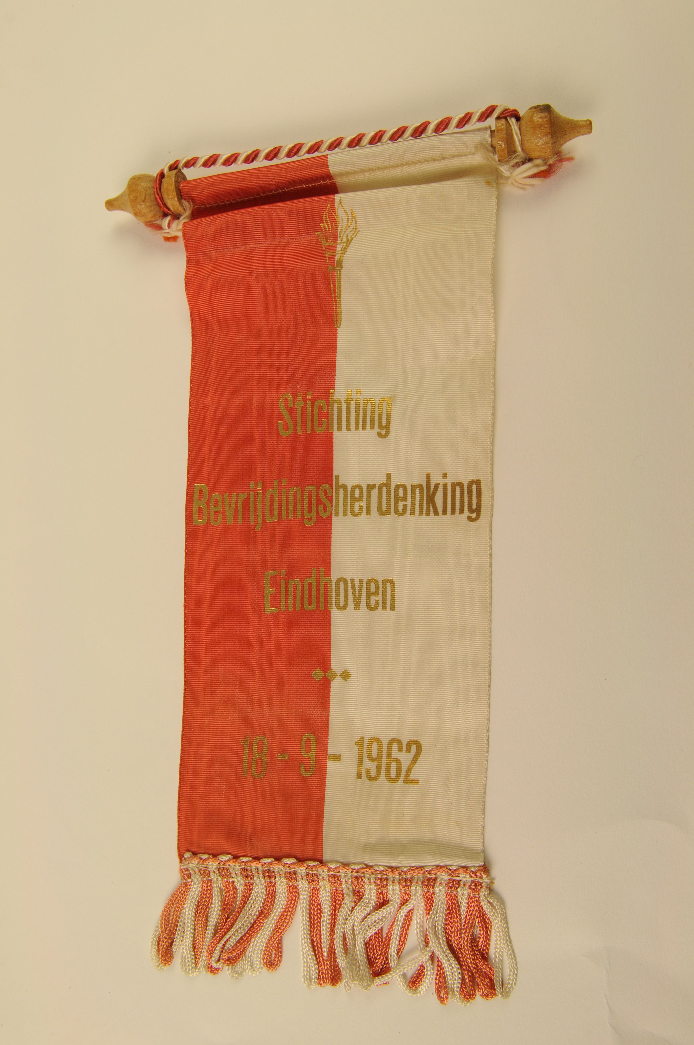Vaantje Stichting Bevrijdingsherdenking Eindhoven – 1962, materiaal: kunstzijde, hout en koord, afmetingen: vaantje 27,5 x 11 cm, vaantje incl. draaghoutje 27,5 x 17 cm, roze-wit verticaal gebaand rechthoekig vaantje met onderaan een rand van roze-witte franje, met bovenaan embleem van de brandende fakkel en in vergulde letters de opdruk: ‘Stichting Bevrijdingsherdenking Eindhoven 18-9-1962’, toestand: goed
