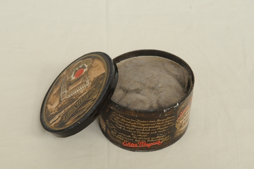 Miniatuur-doosje met fijn haarpluis, stadium in de bewerking van haar tot vilt, materiaal: karton, papier en haar, afmetingen 5,9 x 10 x 11 cm