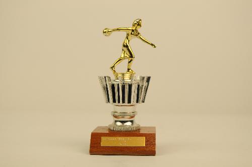 Prijstrofee Kegelclub 'Vol moed' Eindhoven, inschrift: Tournooi 'Herberg 't Hout' 1979 3e pr., kunststof/hout, 16,5 x 7,5 x 7,5 cm