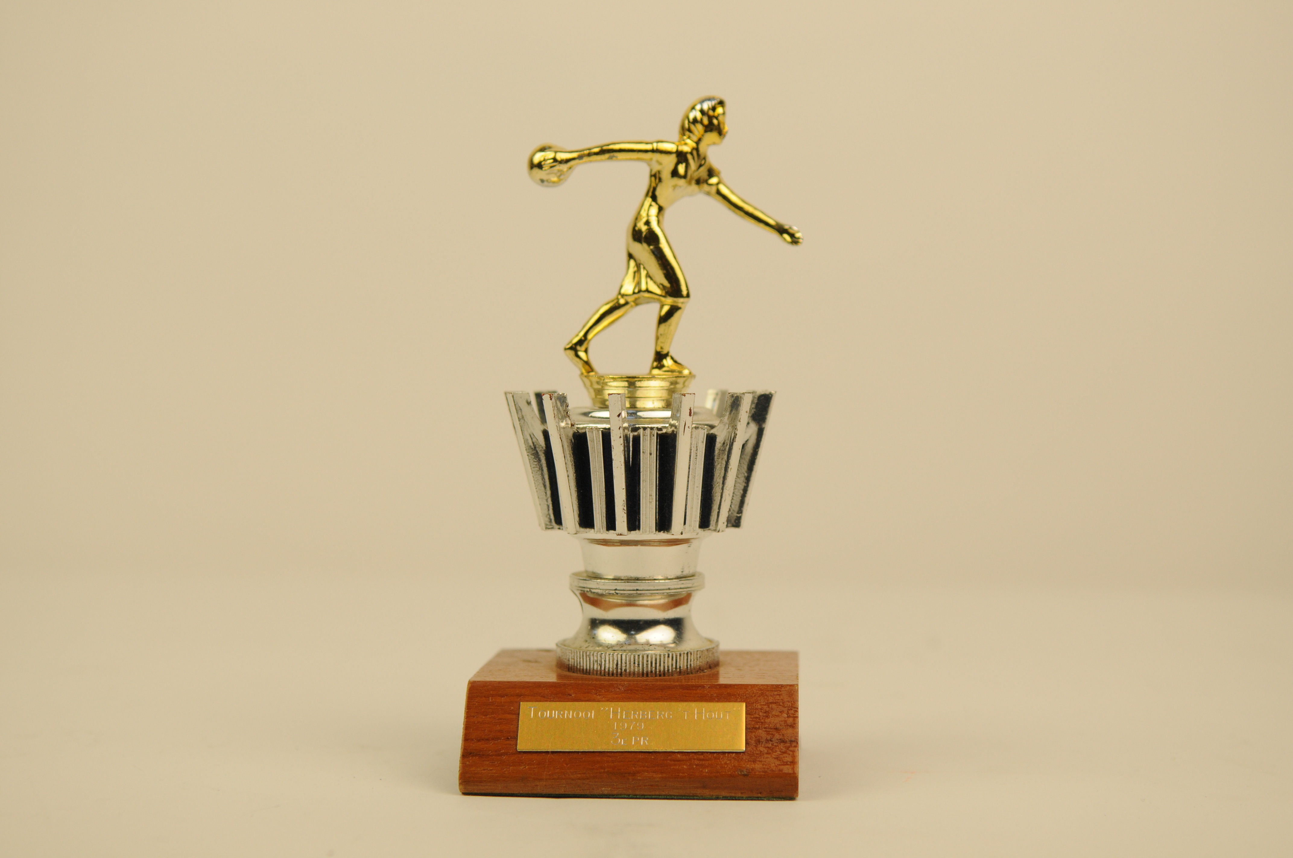 Prijstrofee Kegelclub 'Vol moed' Eindhoven, inschrift: Tournooi 'Herberg 't Hout' 1979 3e pr., kunststof/hout