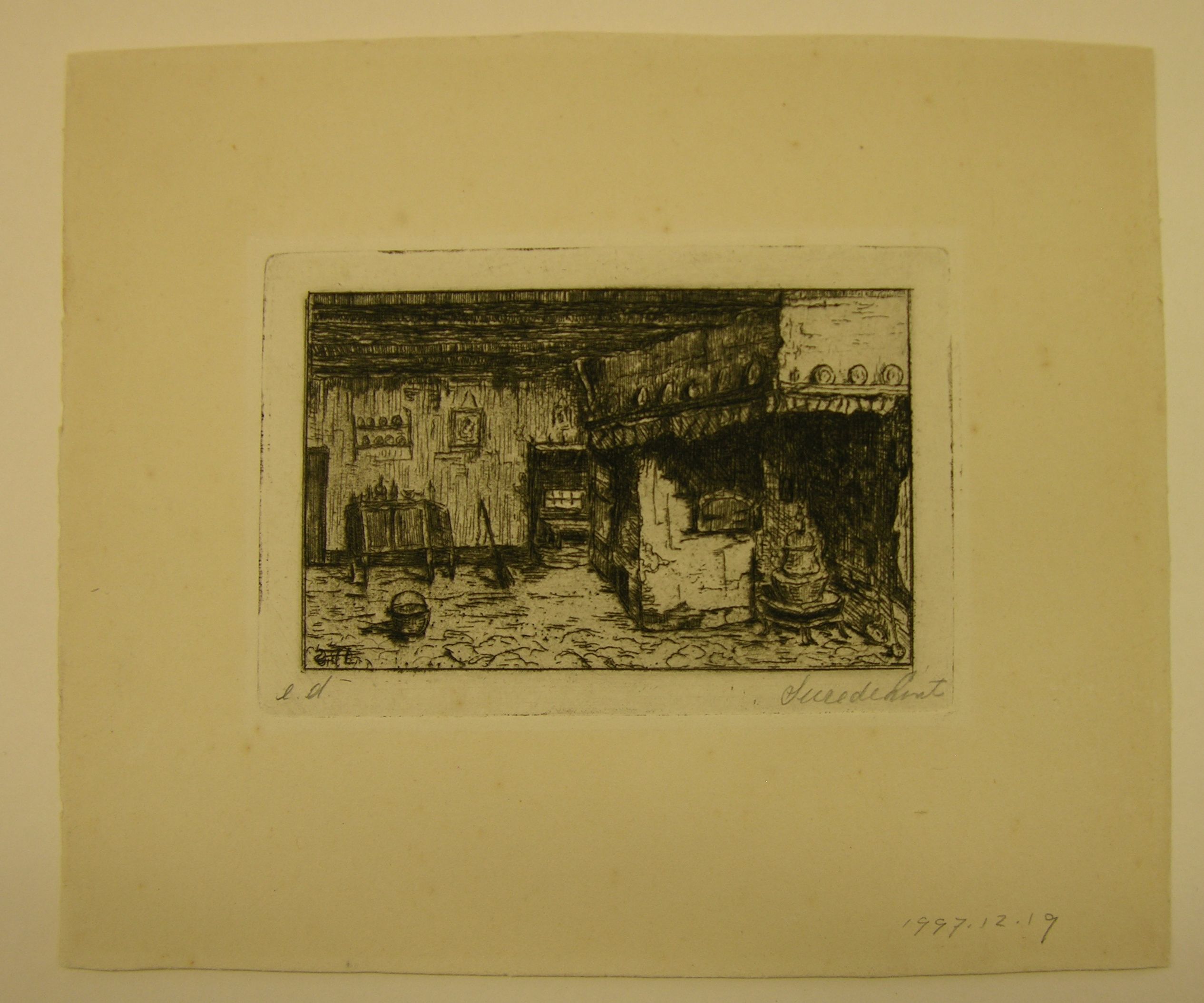 Boereninterieur te Heeze - z.j., ets/papier (e.a.), 55 mm x 90 mm, gemonogrammeerd in plaat l.o.: S.d.L., geannoteerd en gesigneerd in potlood onder plaat: e.a. Suze de Lint Boereninterieur te Heeze - z.j., ets/papier (e.a.), 5.5 cm x 9 cm, gemonogrammeerd in plaat l.o.: S.d.L., geannoteerd en gesigneerd in potlood onder plaat: e.a. Suze de Lint gemonogrammeerd ...