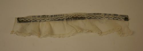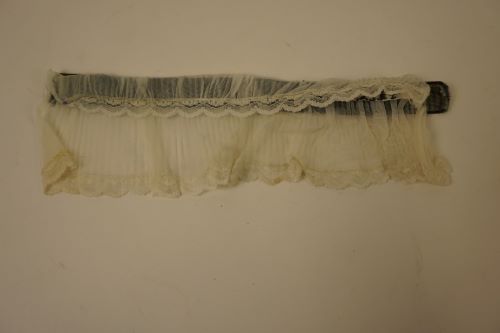 Kanten halsversiering van prinsenkostuum, materiaal nylonkant, kleur wit, lengte 39, breedte 9. Op klittenband. Daarbij manchetten, materiaal nylonkant, kleur wit, lengte 25, breedte 7. Op klittenband. Toestand goed.